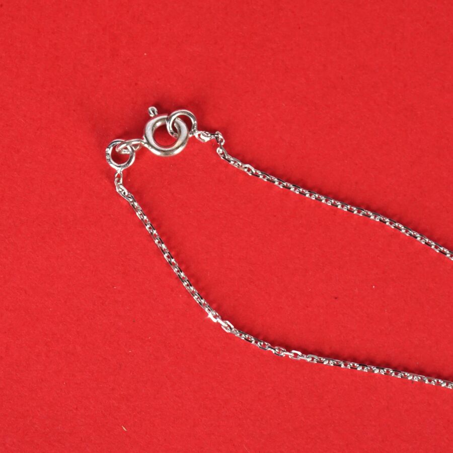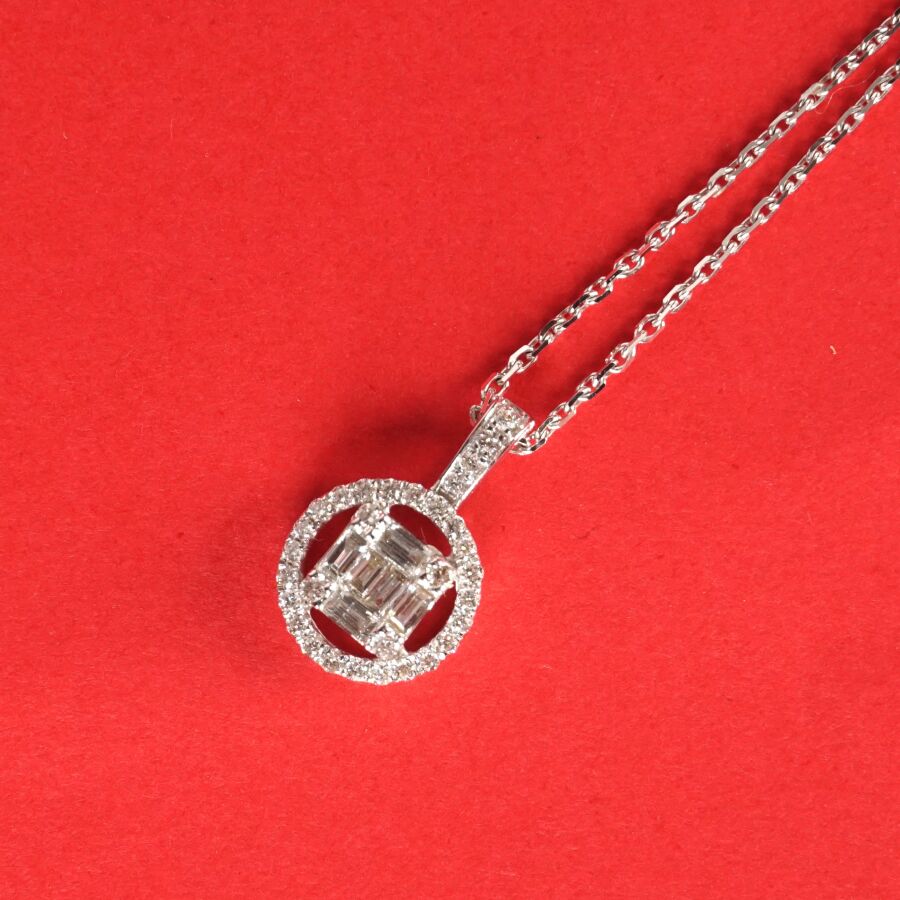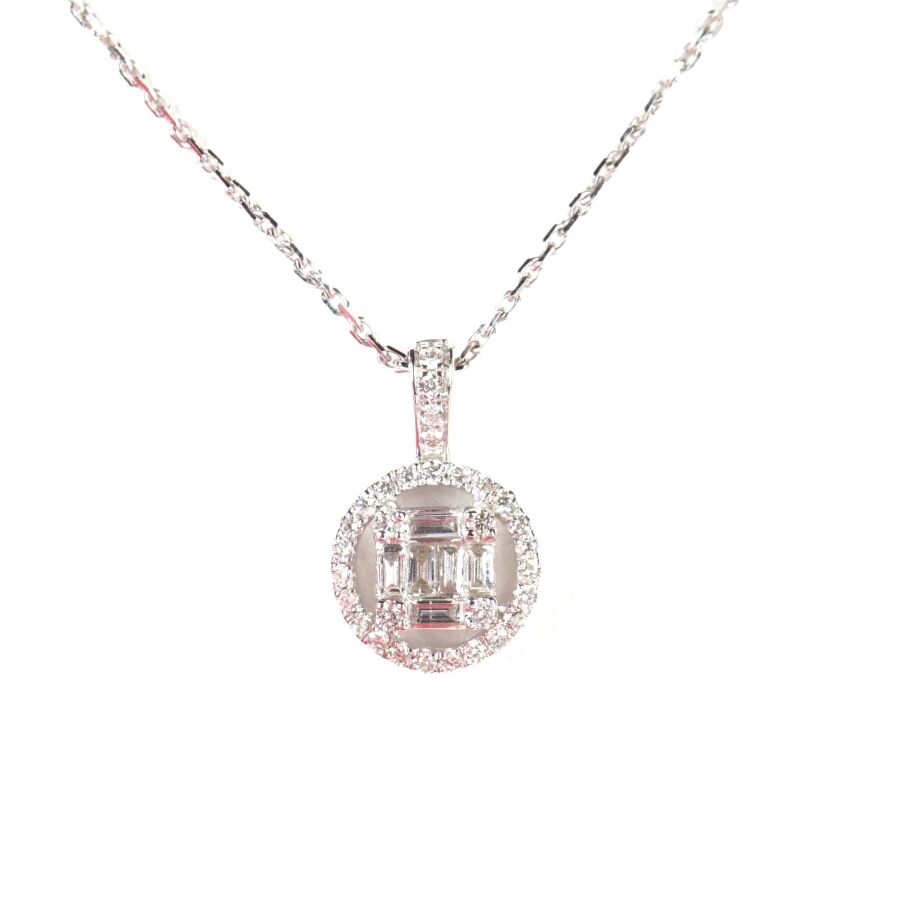 Pendentif rond et sa chaîne en or gris 18K (750/oo), serti en son centre de 6 diamants blancs taille baguette calibrant 0,15 ct environ dans n entourage de 31 diamants blancs taille moderne calibrant 0,15 ct environ, avec sa chaîne maille forçat, fermoir anneau ressort, L. 45 cm. Poids brut : 2.9 g environ.