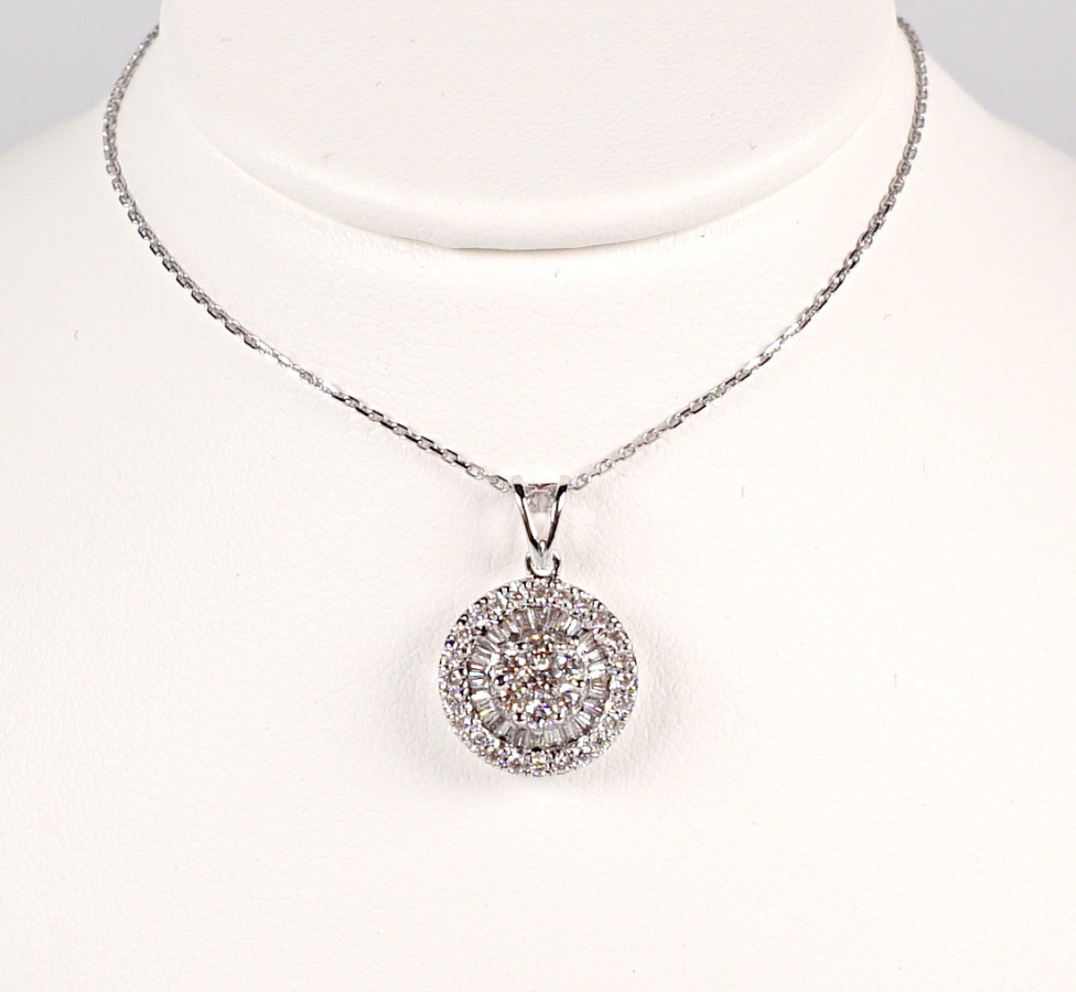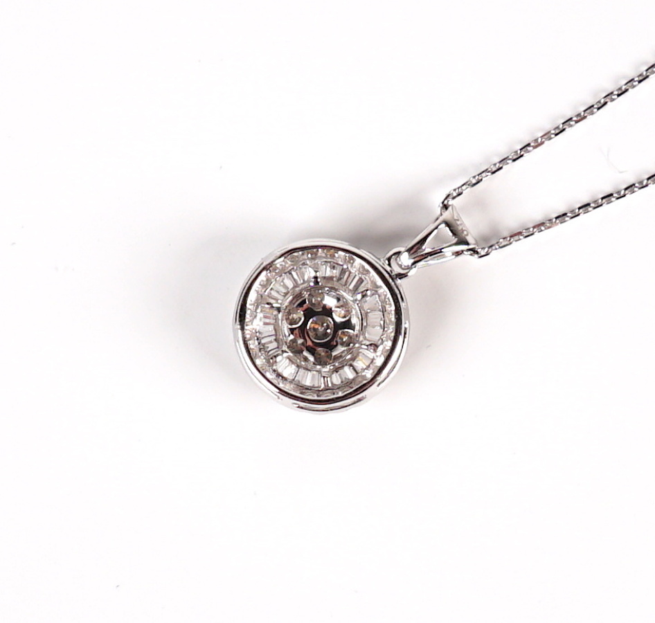Pendentif "Rosace" et sa chaîne maille forçat diamantée en or blanc 18 K (750/oo) serti en son centre d'un pavage de 7 diamants blancs taille moderne et d'un entourage de 24 diamants blancs taille moderne pesant ensemble 0.25 ct, intercalés par un cerclage de 24 diamants blancs taille baguette 0.1 ct. Dim : 17 x 11 mm. L. de la chaîne : 45 cm. Poids brut : 2.3 g environ.