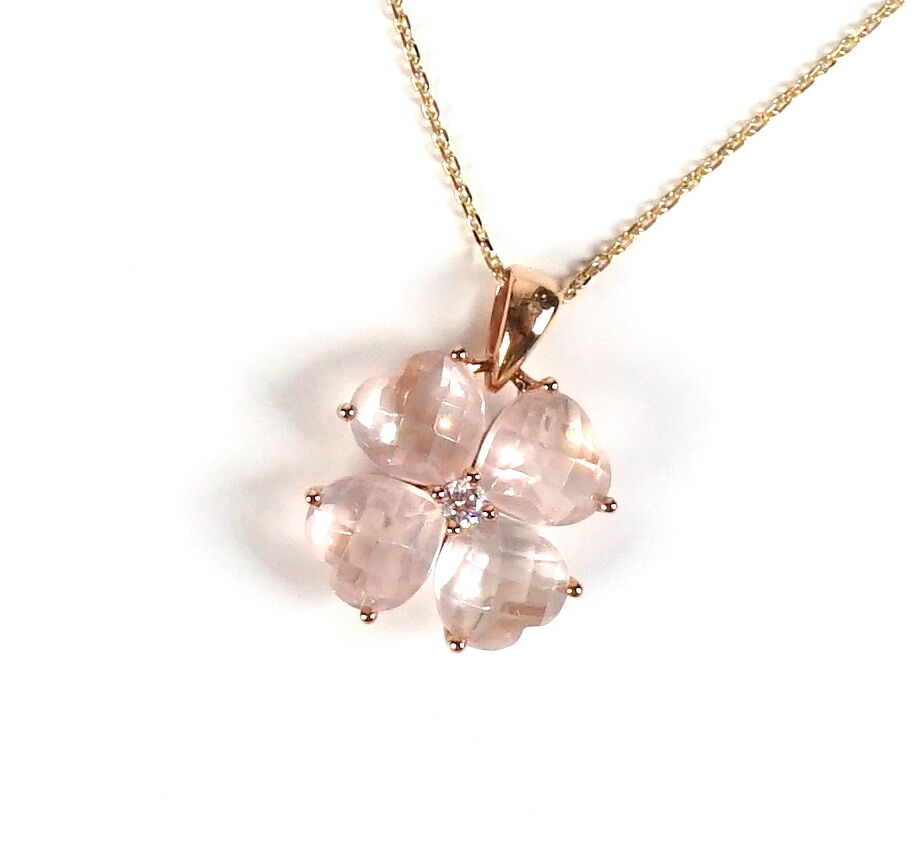 Pendentif "Trèfle" en or rose 18K (750/oo), serti de 4 quartz roses facettés et taillés en coeur, pesant ensemble 3.10 carats environ, agrémenté au centre d'un diamant blanc taille moderne calibrant 0.05 carat environ, H. 1.5 cm.