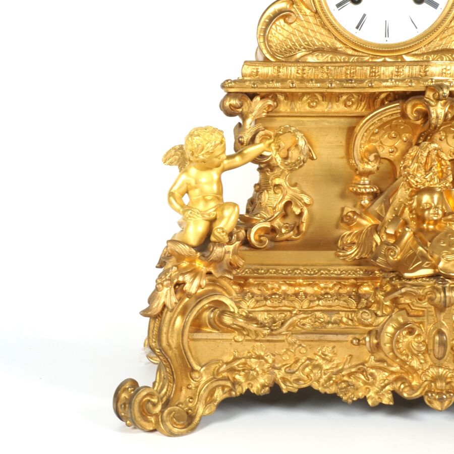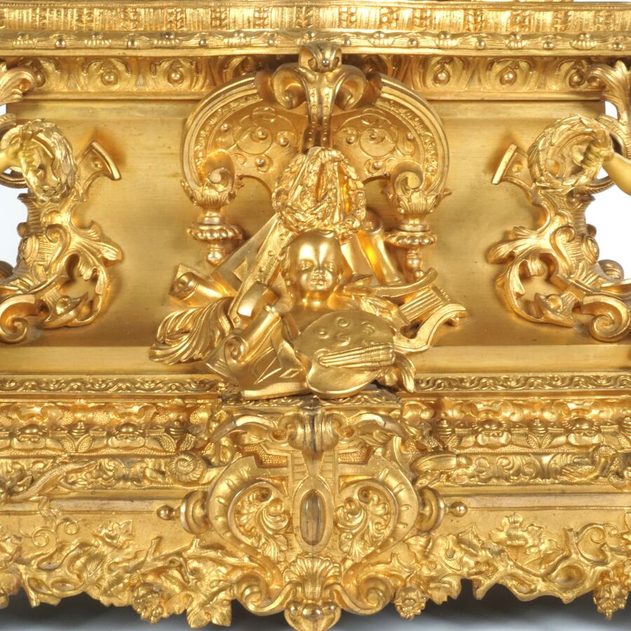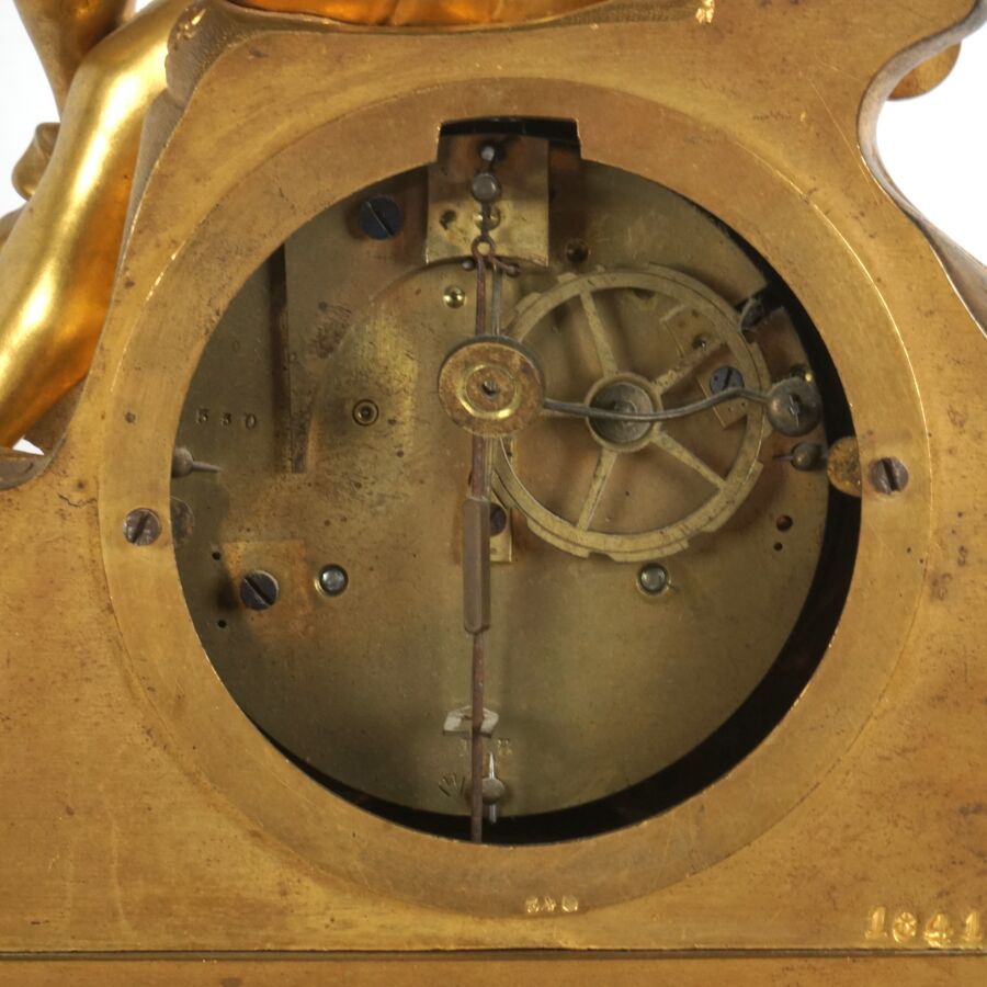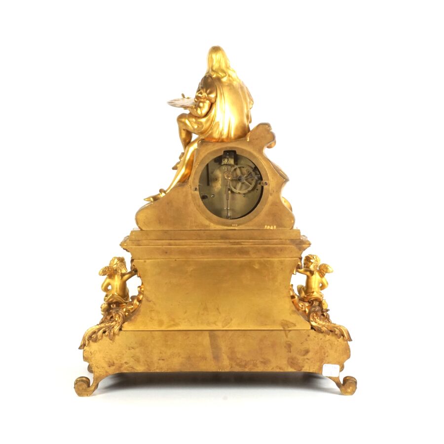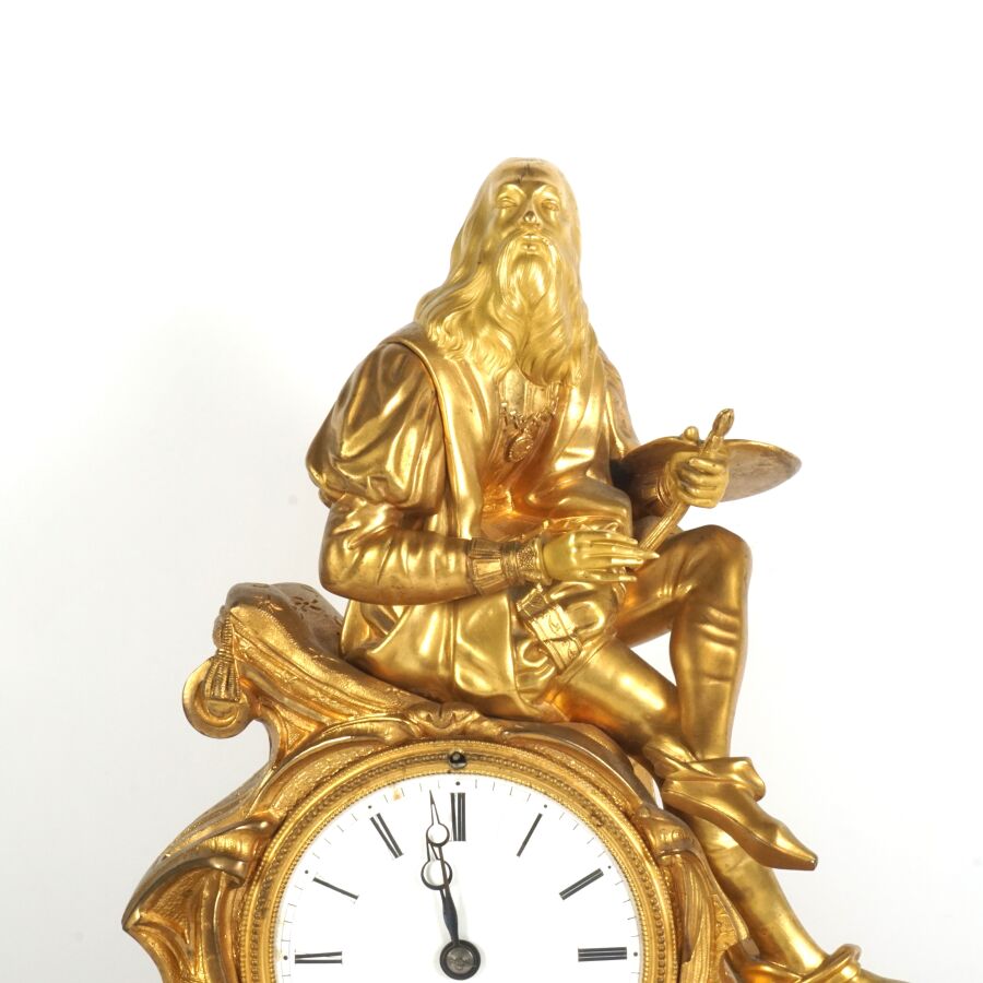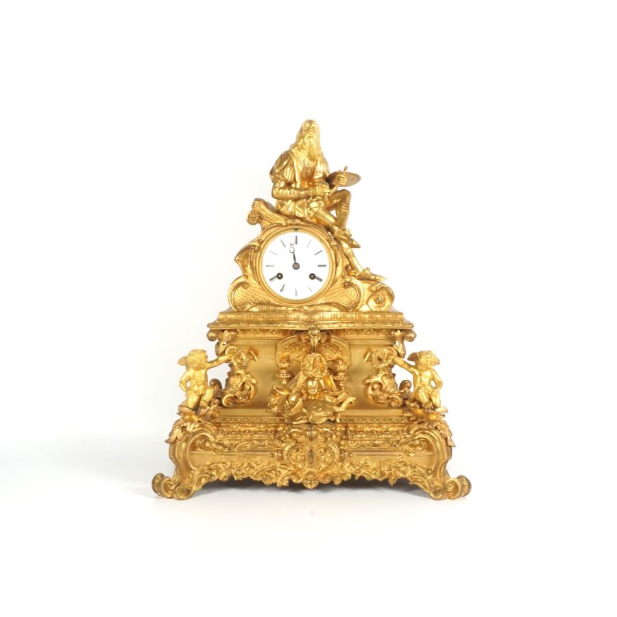 Pendule à poser en bronze à patine dorée, cadran émaillé blanc (sans verre), chiffres romains pour les heures, surmonté d'un personnage assis figurant Léonard de Vinci tenant sa palette, reposant sur une base richement ornée d'amours, insectes et végétaux, datée 1941, Dim. 47 x 39 cm (avec son balancier, petites usures à la patine).
