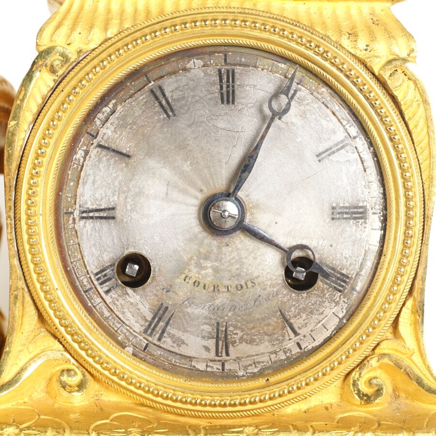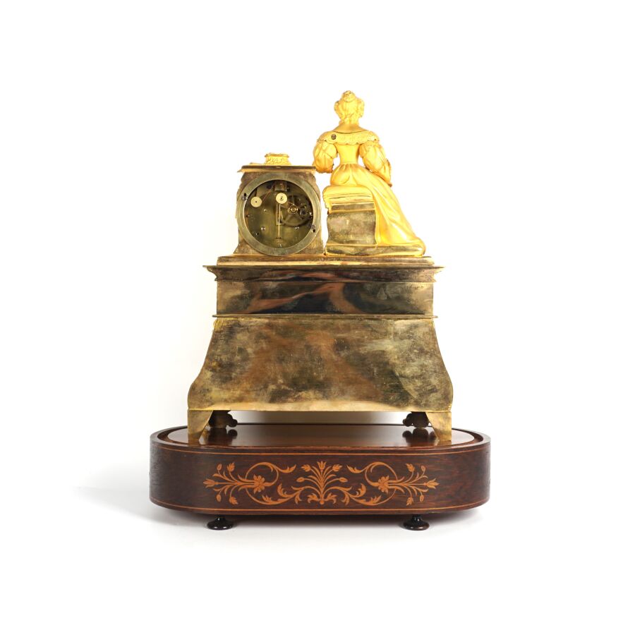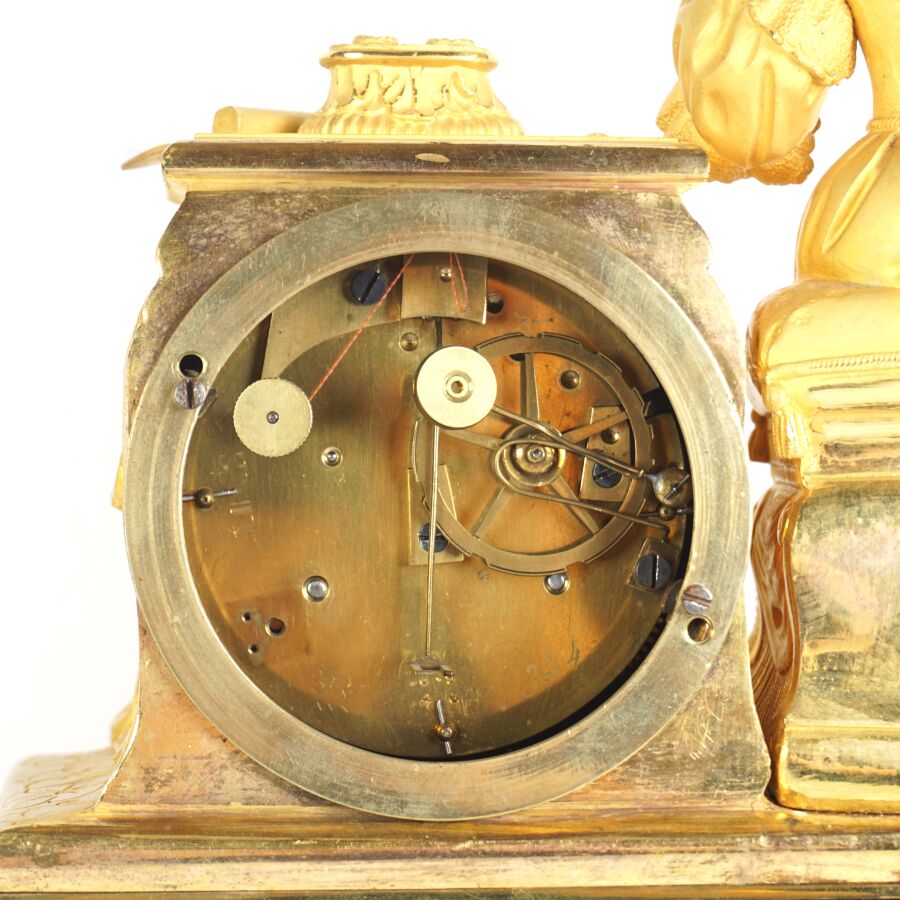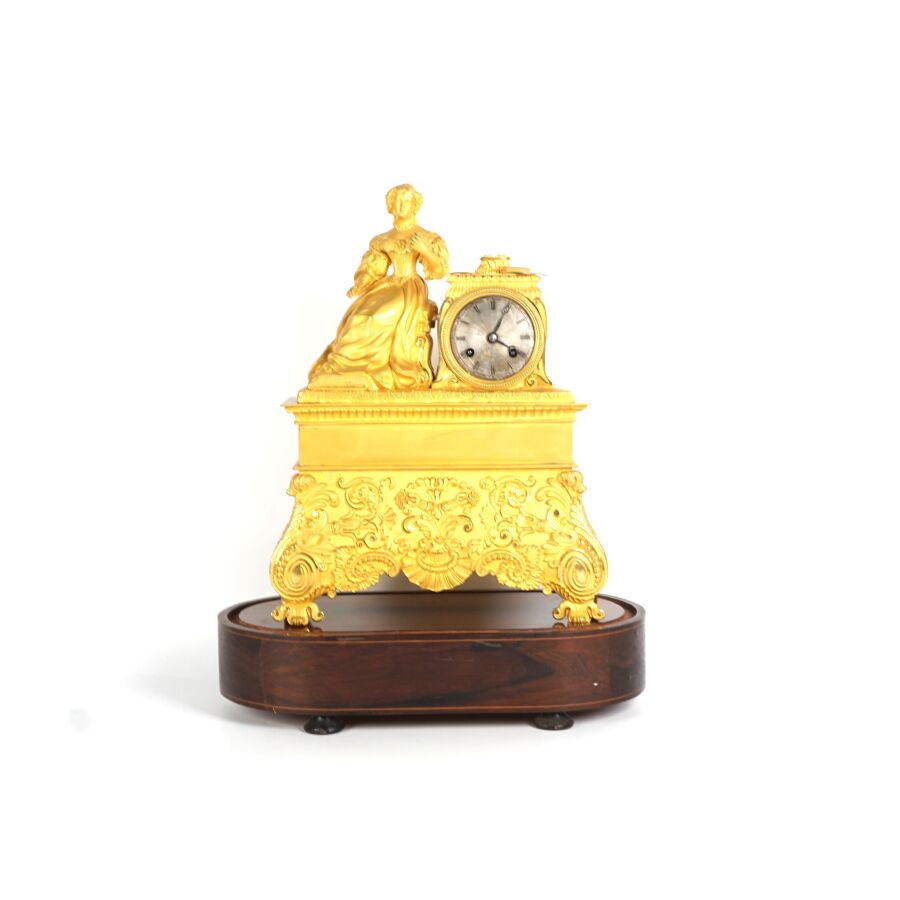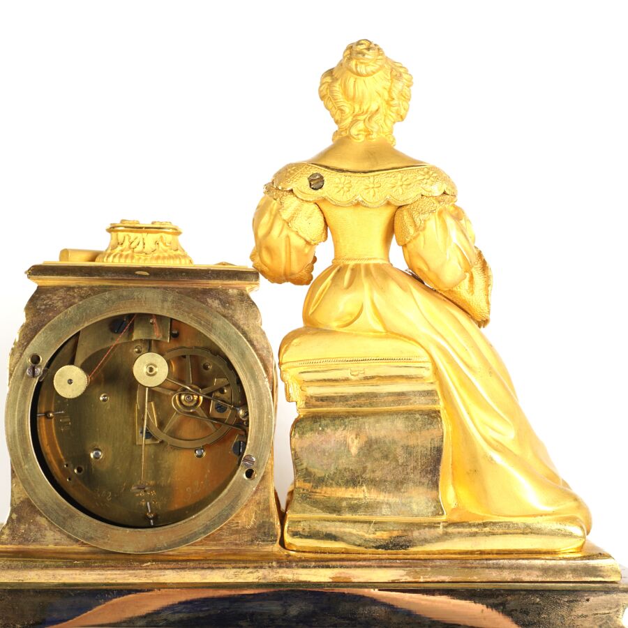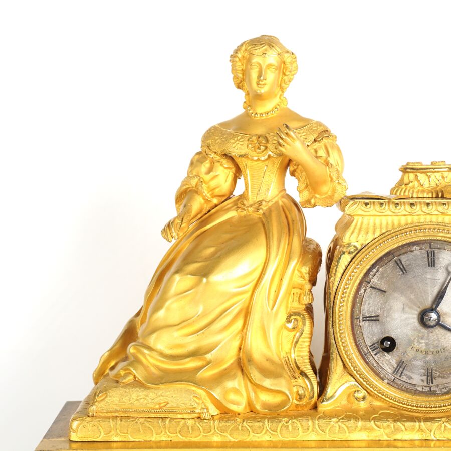 Pendule à poser en bronze doré, cadran en métal gris signé "Courtois", chiffres romains pour les heures, encastré dans une borne surmontée de livres, une femme assise à côté à la lecture, reposant sur quatre pieds à enroulement richement ornés de feuillages et entrelacs, socle ovale en bois (sans son globe en verre) et globe en verre, dans le goût de l'époque Romantique, fin du 19ème siècle, 38 x 28 x 9 cm (usures).