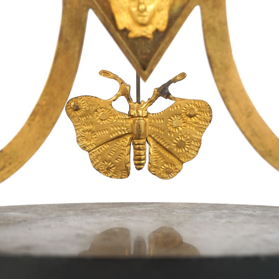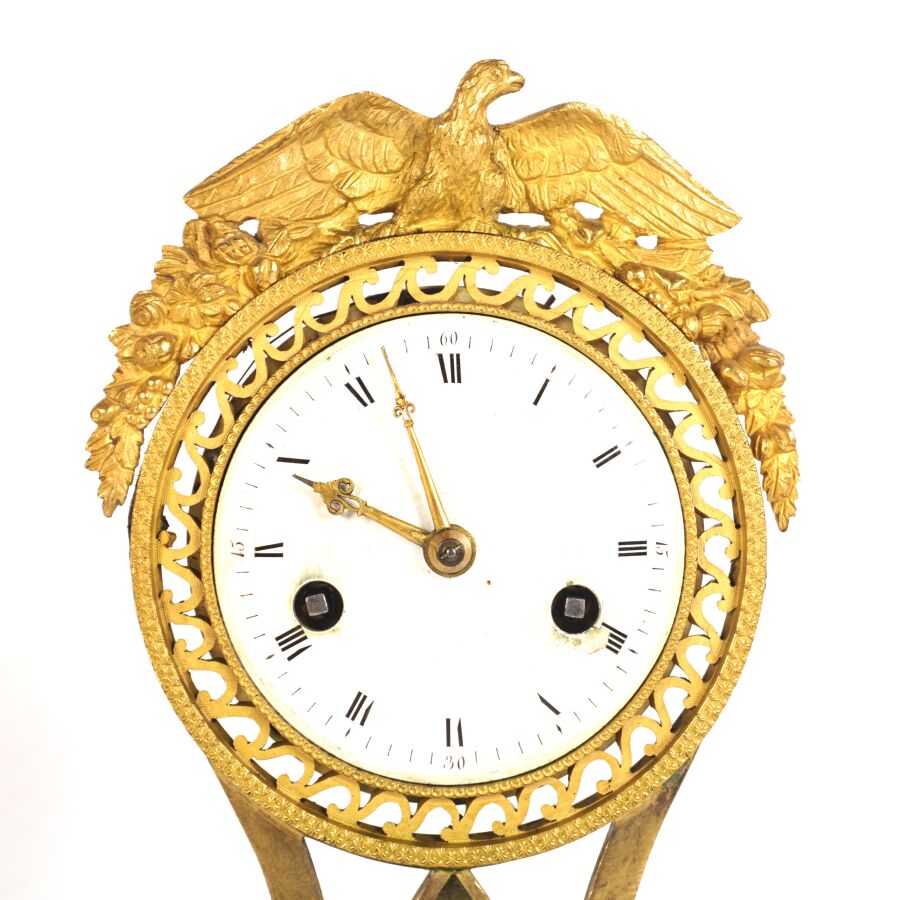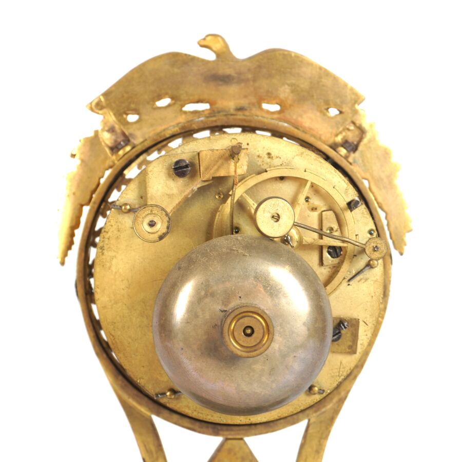 Pendule à poser en bronze doré ciselé, cadran émaillé blanc, chiffres romaines pour les heures, surmonté d'un aigle aux ailes déployées et d'une guirlande végétale, piétement double à enroulement, balancier à motif d'un papillon ciselé, reposant sur un socle ovale en marbre noir, seconde moitié du 19ème siècle, H. 28 cm (avec sa clé, égrenures, usures, sans cache en verre).