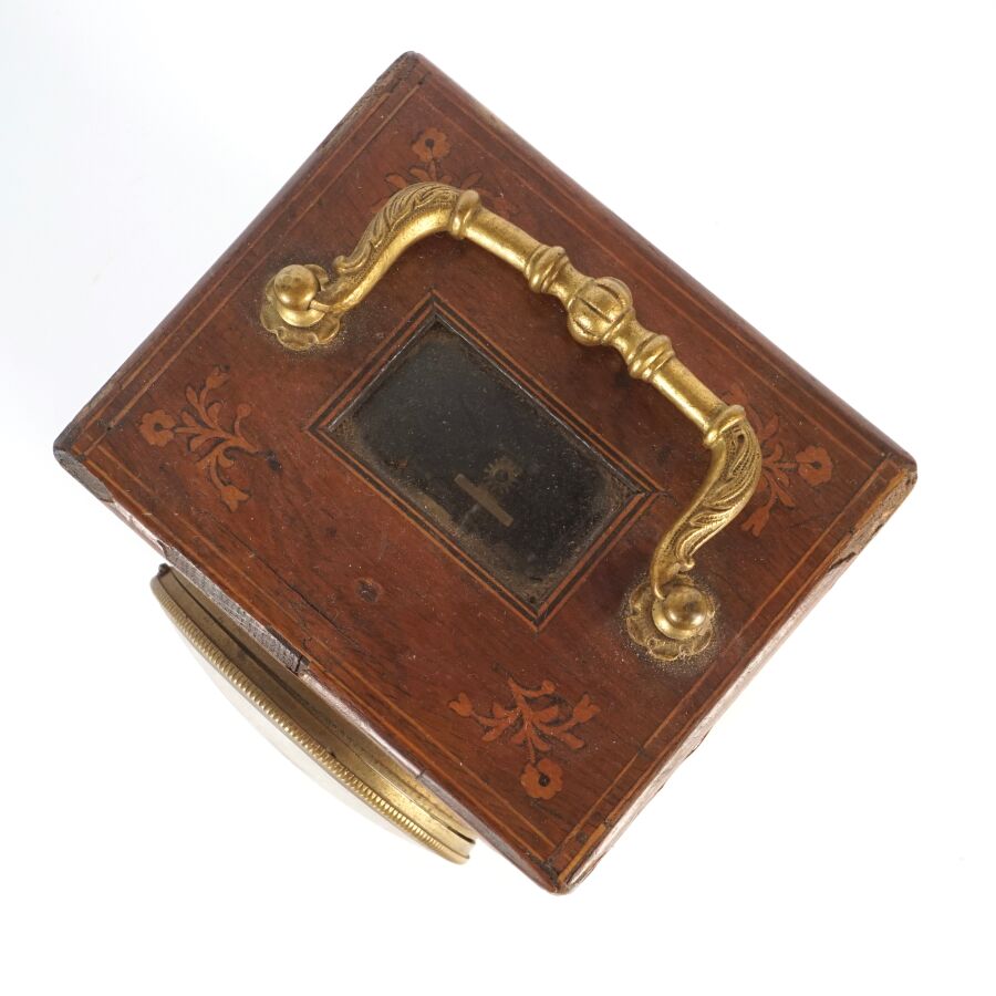 Pendule borne de style restauration en bois de placage et incrustations à motif de rinceaux, circa 1860, 22 x 13 cm (sans clé, petites usures).