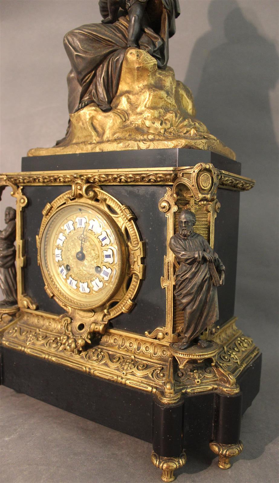 Pendule borne en bronze à deux patines, présentant une Vierge à l'enfant, cadran en cuivre repoussé et émaillé, chiffres romains, circa 1880, H. 54 cm (petits manques et un pied à refixer)