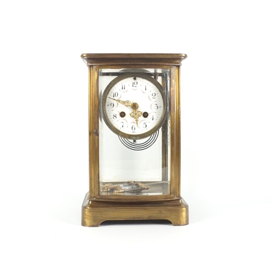 Pendule borne en laiton, cadran émaillé blanc à décor polychrome de fleurettes, chiffres arabes pour les heures, vitrée, balancier au mercure, circa 1900, 27 x 17 x 13 cm.