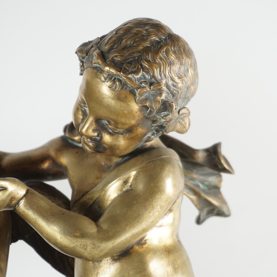 Pendule, bronze doré et albâtre, le cadran émaillé blanc (avec son cache en verre), chiffres romains pour les heures, surmonté de deux angelots aux coquillages, fin du 19ème siècle, H. 46 cm. L. 41 cm (avec sa clé, usures à la patine, accident à un doigt).