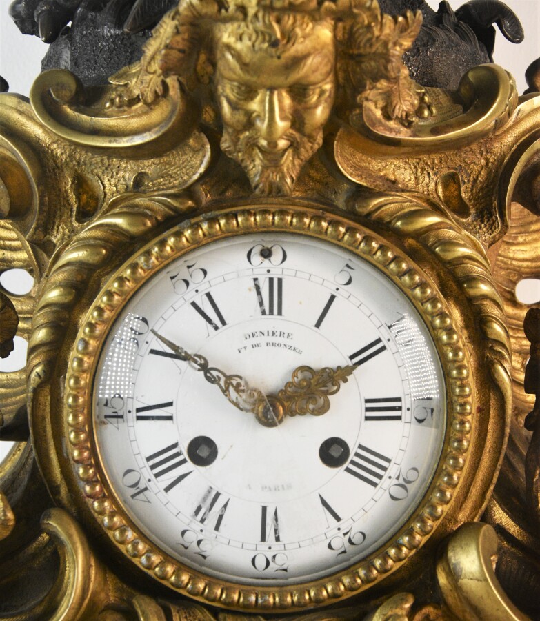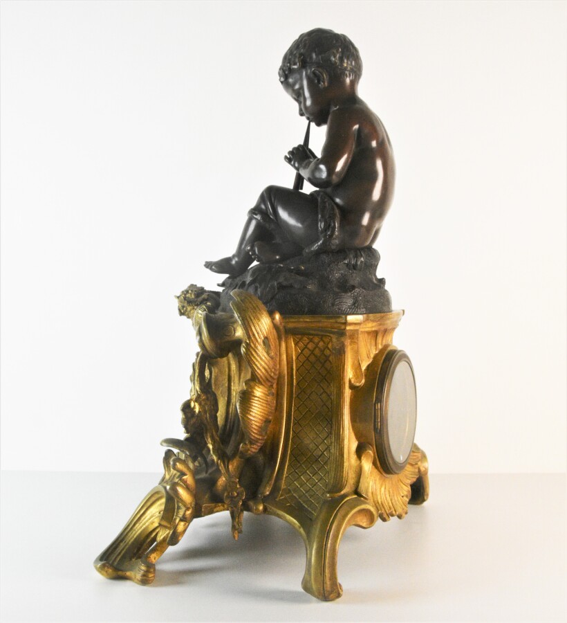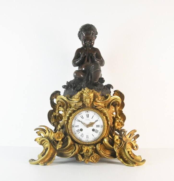 Pendule en bronze à deux patines "Le joueur d'aulos", la base dorée à riche décor dans le goût rocaille de fleurs et feuillages, le cadran marqué "DENIERE, fabricant de bronzes à Paris", fond émaillé blanc, les heures en chiffres romains et les minutes en chiffres arabes, l'ensemble surmonté d'un sujet à patine brune figurant un enfant assis et jouant d'une flûte double, H. 48 cm (avec sa clé et son balancier, usures à la patine, cache en verre du cadran à refixer).