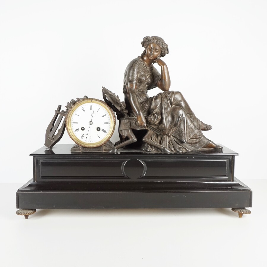 Pendule en régule et marbre, le cadran émaillé blanc (avec son cache en verre), chiffres romains pour les heures, surmonté d'une allégorie de la musique figurant Sainte Cécile, inscriptions sur la lyre "Moreau SCL", reposant sur quatre pieds toupies, L. 55 cm (avec sa clé, petites usures et égrenures au marbre).