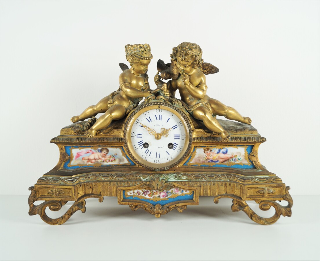 Pendule Napoléon III en bronze doré surmontée de deux putti, agrémentée de plaques en porcelaine de Paris à décor émaillé polychrome d'angelots tenant des couronnes de fleurs dans les nuages, le cadran émaillé blanc, chiffres romains bleus marine en léger relief pour les heures et chiffres arabes pour les minutes, marqué "PESANT à Grenoble", 19e siècle, H. 29 cm, L. 40 cm (usures, saut d'émail au cadran, oxydations au bronze, une aile à refixer). On joint un petit bougeoir à main en bronze doré, H. 10 cm.