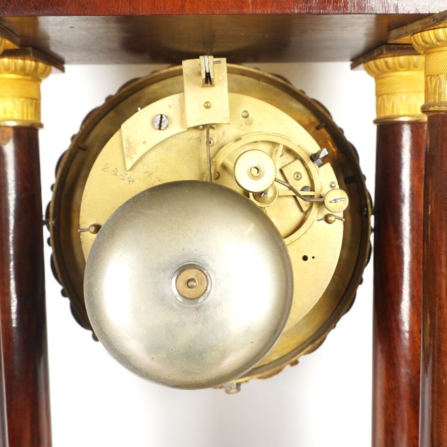 Pendule portique à quatre colonnes en acajou et placage d'acajou, ornements et cadran en bronze ciselé et doré, chiffres romains pour les heures, de style Empire, H. 47 cm (avec son balancier et sa clé).