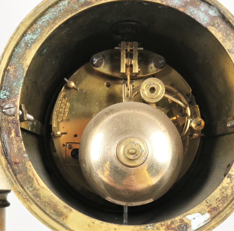 Pendule portique en albâtre et ornementation de bronze doré et ciselé, surmontée d'un vase à l'antique et d'une guirlande végétale agrémentée d'un noeud, le cadran émaillé blanc orné de guirlandes florales polychromes, chiffres arabes pour les heures, mouvement "Société clusienne SCRPH, n° 8112", circa 1900, 51 x 26 cm (avec balancier et clé, usures et petits éclats).