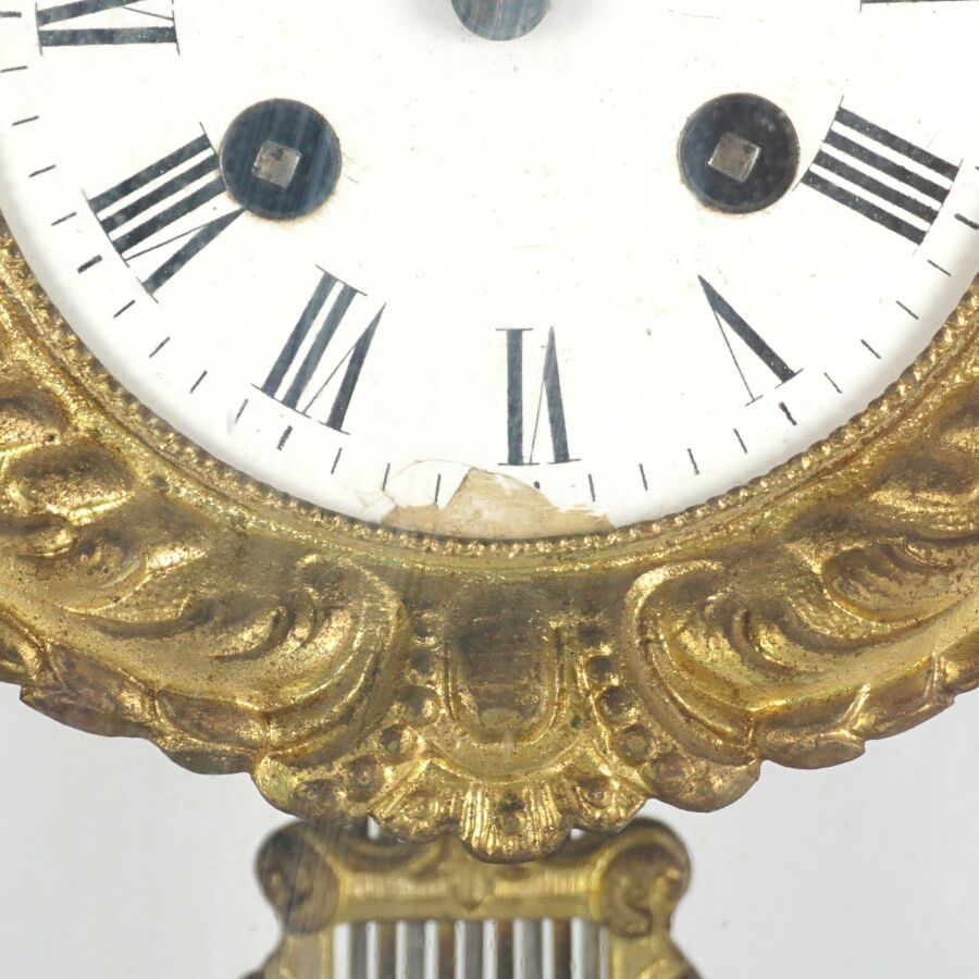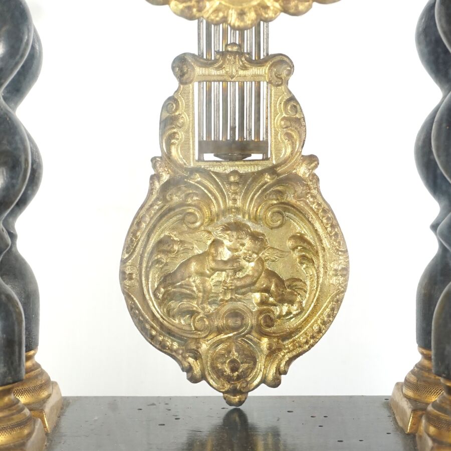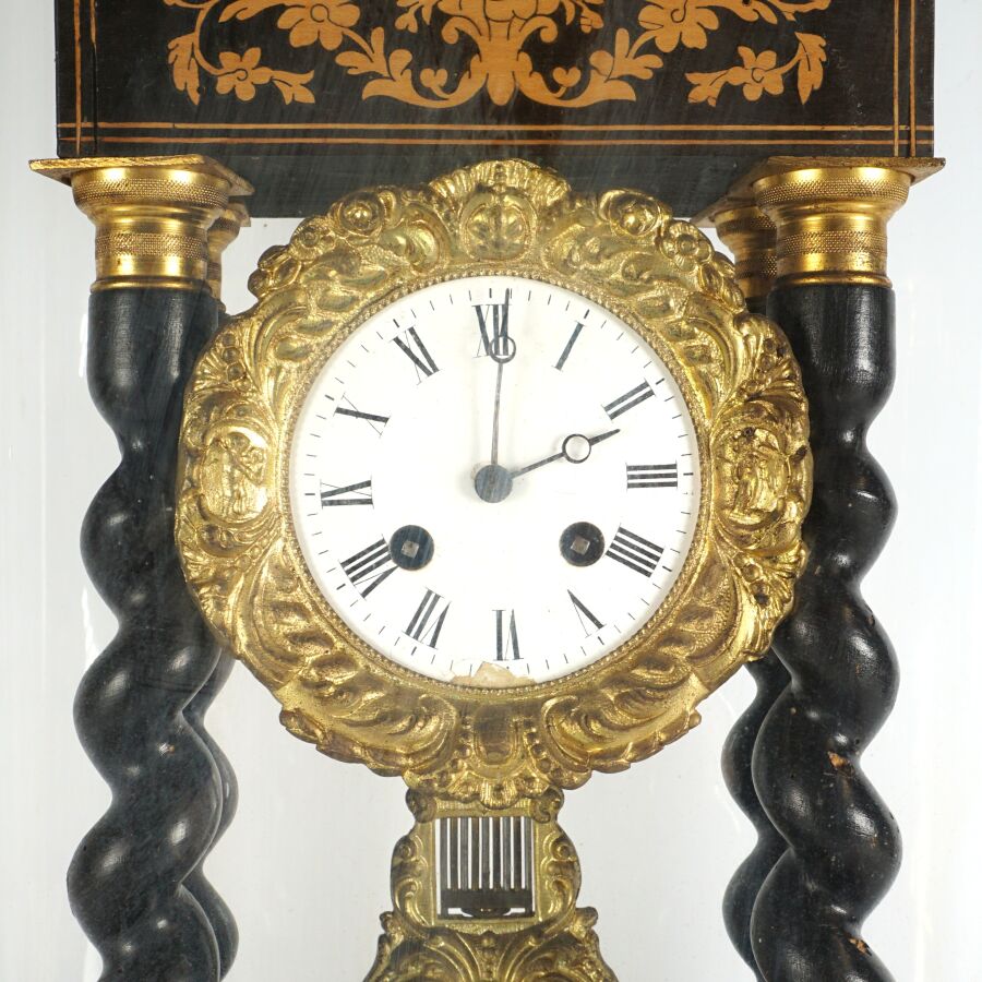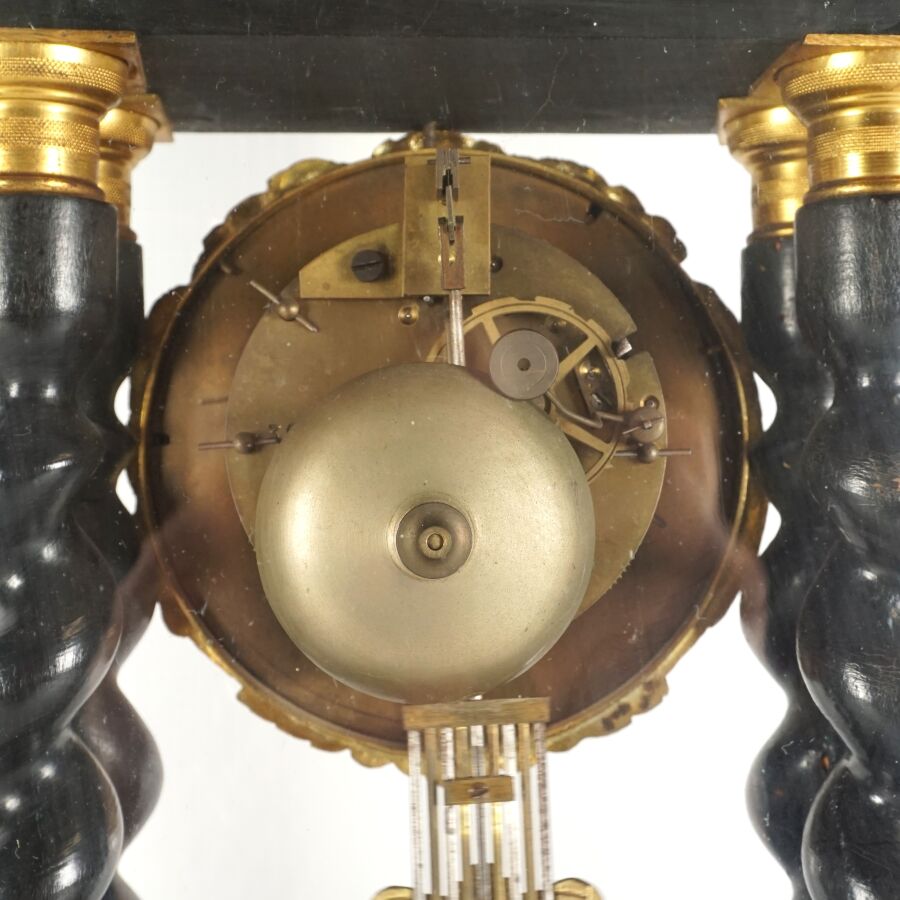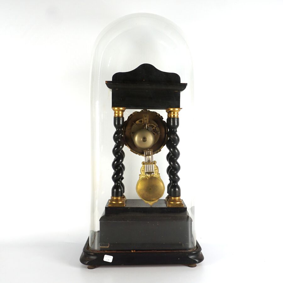 Pendule portique en bois de placage, bois blond et bois noirci à colonnes torsadées, cadran émaillé blanc, chiffres romains pour les heures, avec son globe en verre, H. 50 cm (hors socle et globe) (avec son balancier, éclat au cadran, légèrement vermoulu).