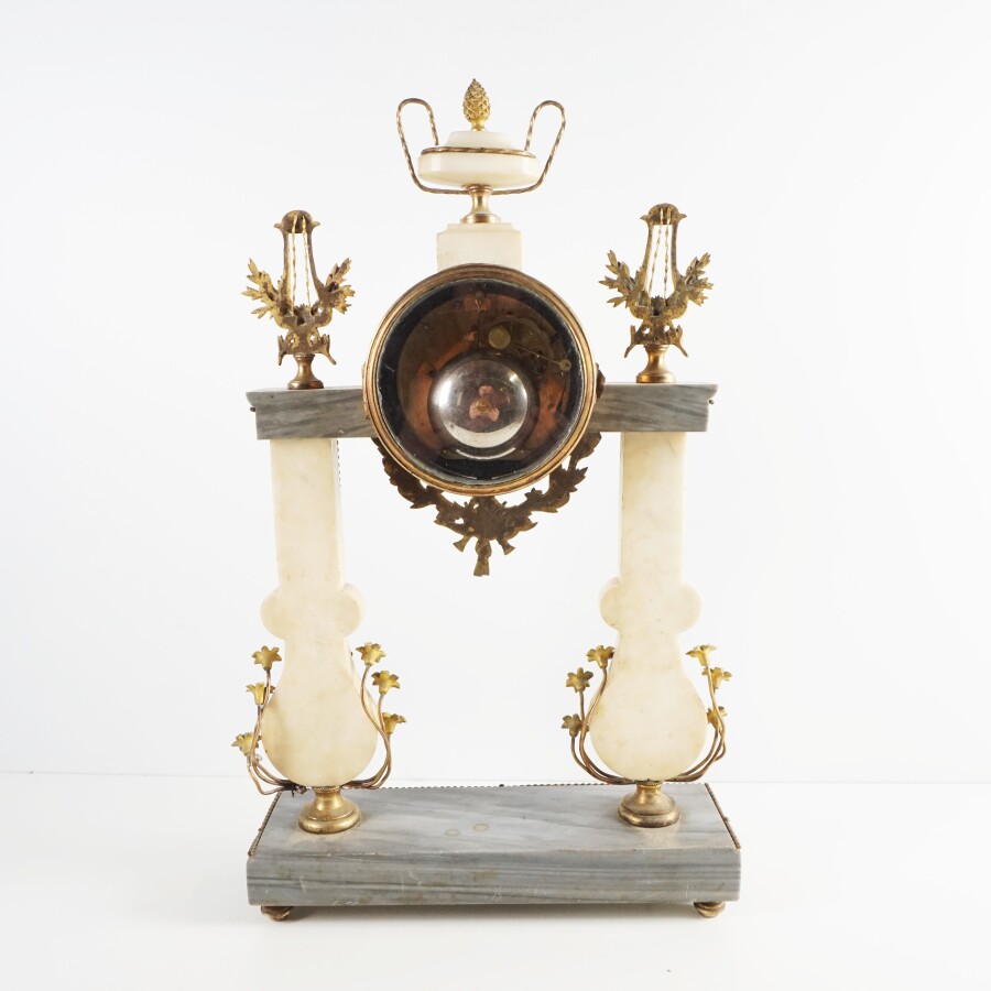 Pendule portique, marbre blanc et bronze doré, cadran émaillée blanc (avec son cache en verre) signé "Charles Péromet, Paris", chiffres arabes pour les heures, surmonté d'un vase à l'Antique agrémenté d'un fretel figurant une pomme de pin et deux lyres, le cadran soutenu par une guirlande végétale et trophée, les deux colonnes ornées de pastilles en biscuit bleu et blanc, dans le goût de Wedgwood à motif de scènes à l'Antique, reposant sur une base rectangulaire en marbre gris, fin du 18ème siècle, H. Totale : 47 cm. L. 27.5 cm (avec son balancier, sans clé, usures, cache arrière à refixer, quelques égrenures).