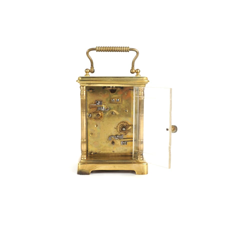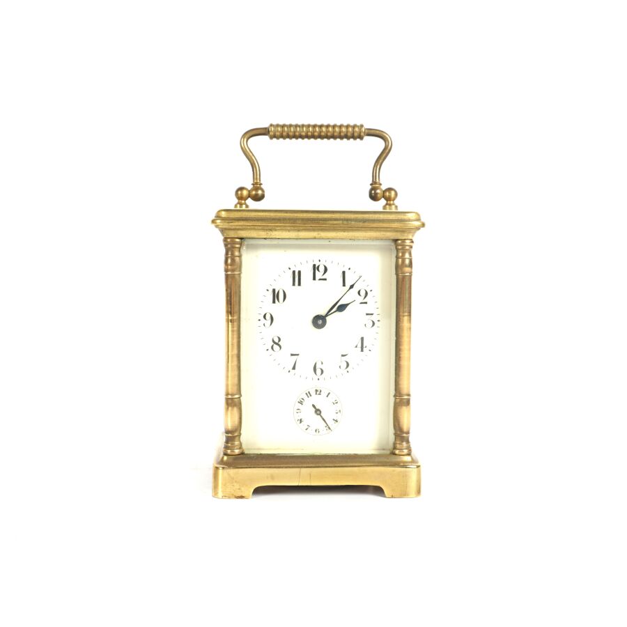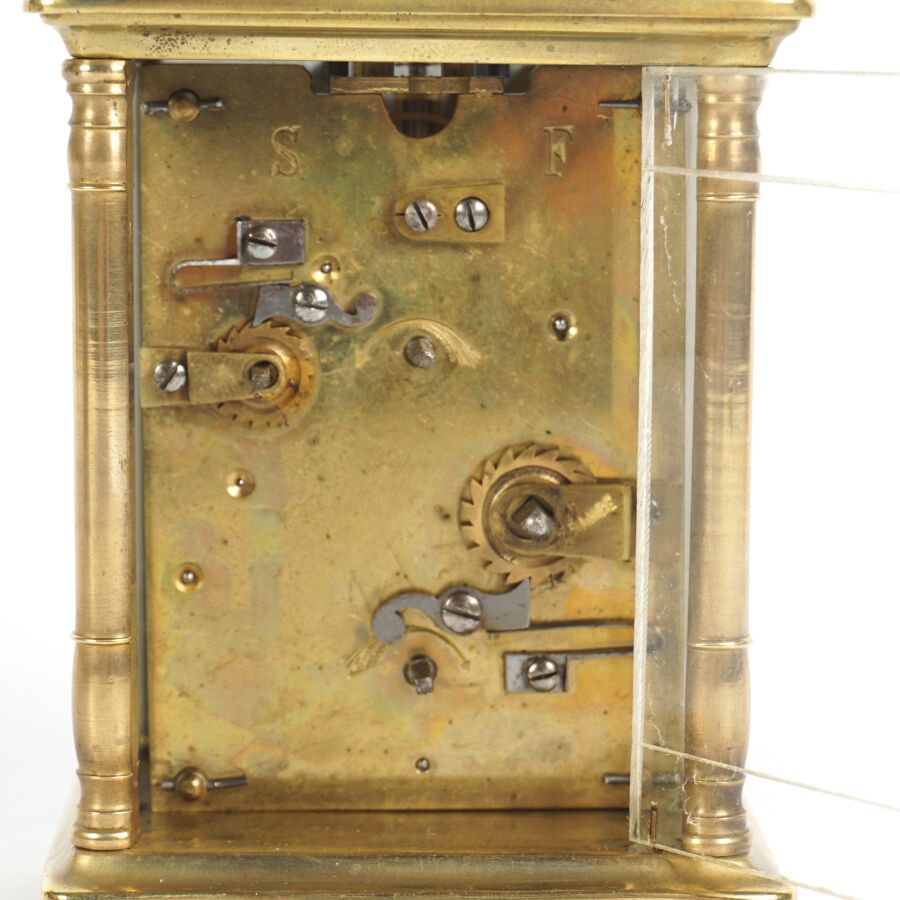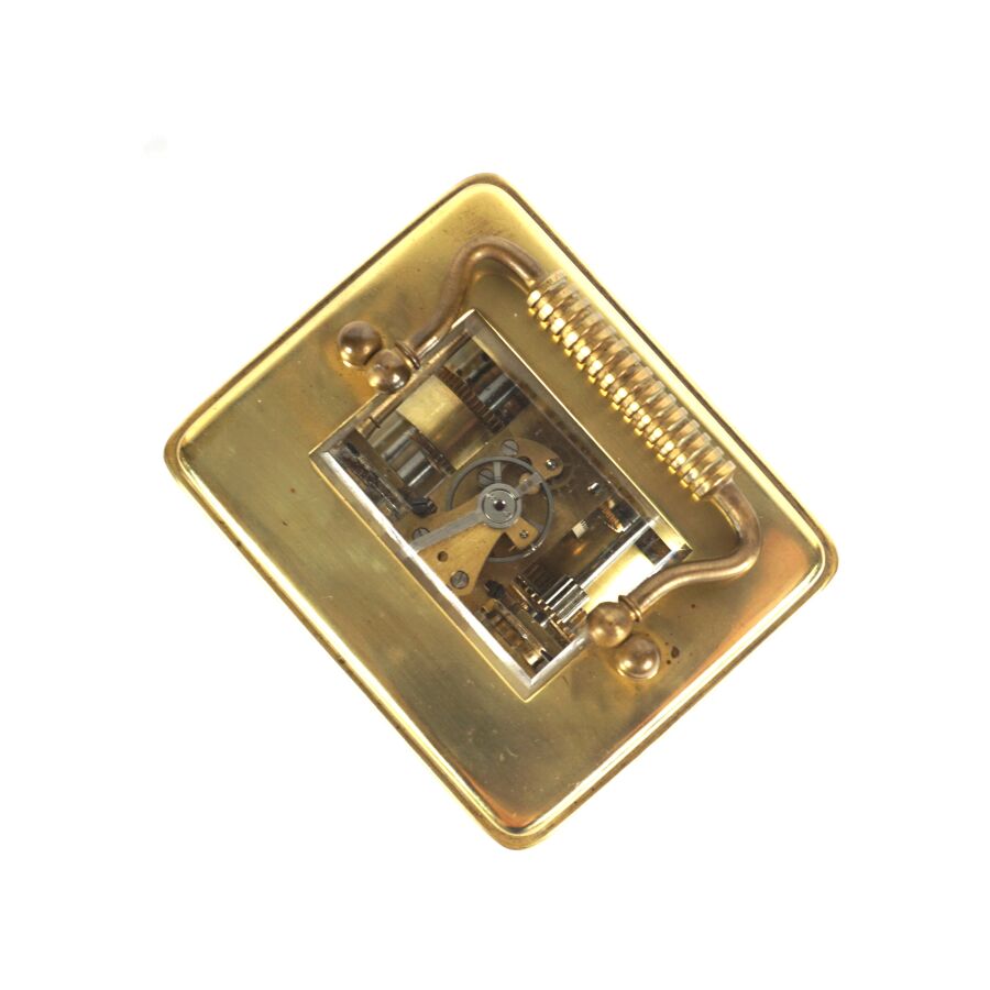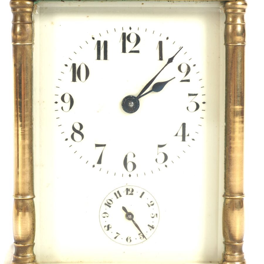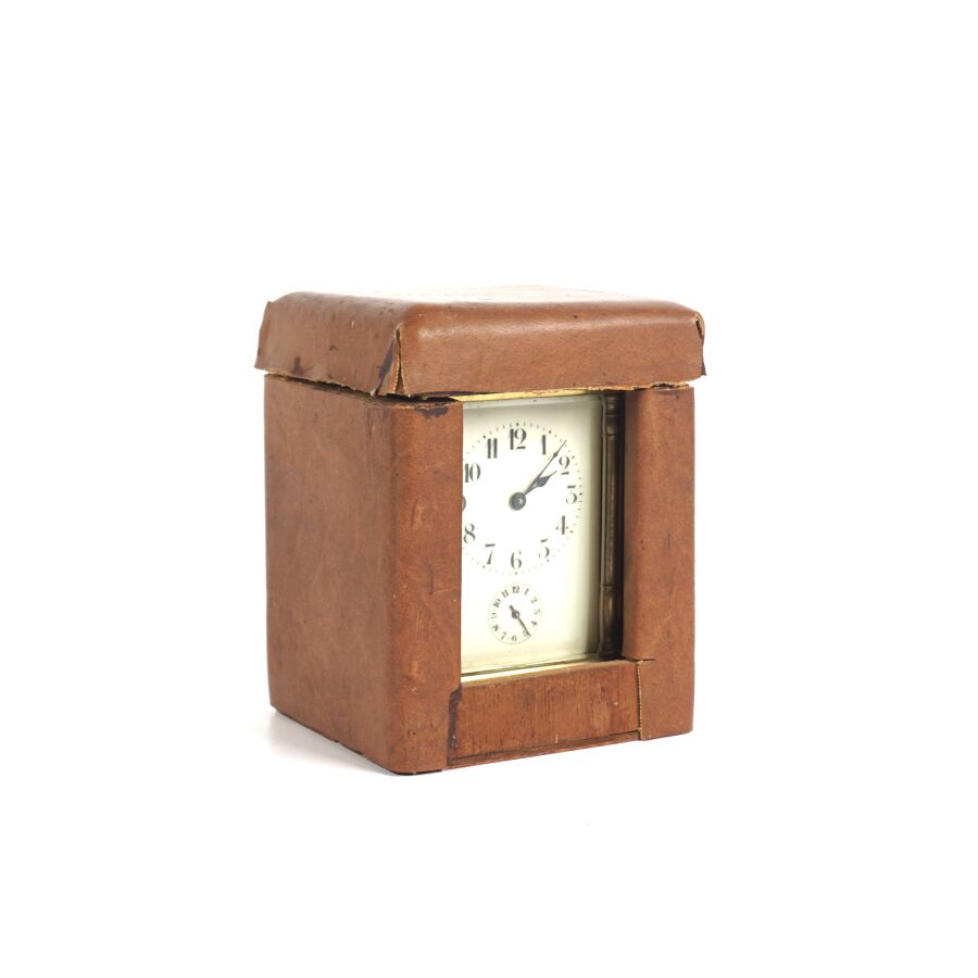 Pendulette d'officier dite de voyage, laiton et verre, cadran émaillé blanc, chiffres arabes pour les heures, présentée dans son coffret d'origine en cuir, circa 1890, Dim. 11 x 8 cm (avec sa clé).