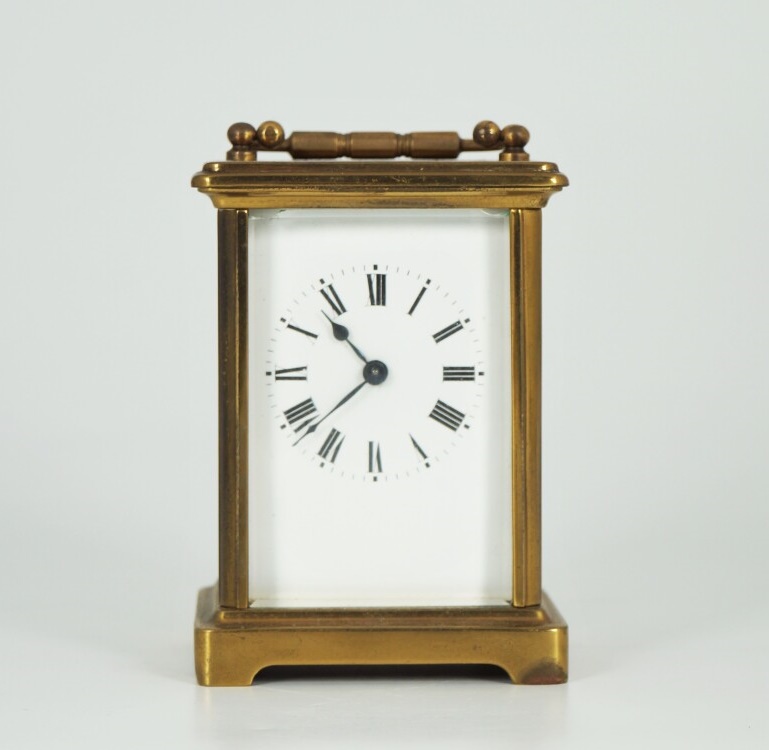 Pendulette d'officier en laiton, le cadran émaillé blanc, chiffres romains pour les heures, H. 12 cm (petits éclats).