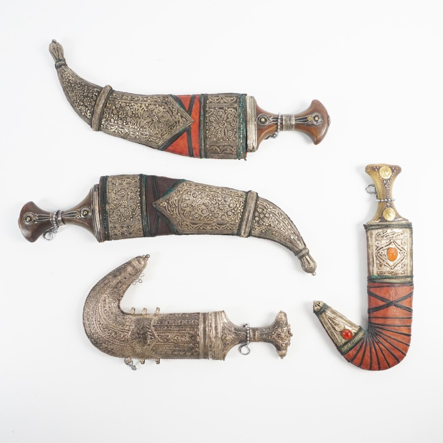 PENINSULE ARABIQUE - Ensemble comprenant 4 DJYAMBIAS, poignées en corne, lames courbes à arêtes médianes, fourreaux gainés de cuir et de métal, seconde moitié XXème, TBE.