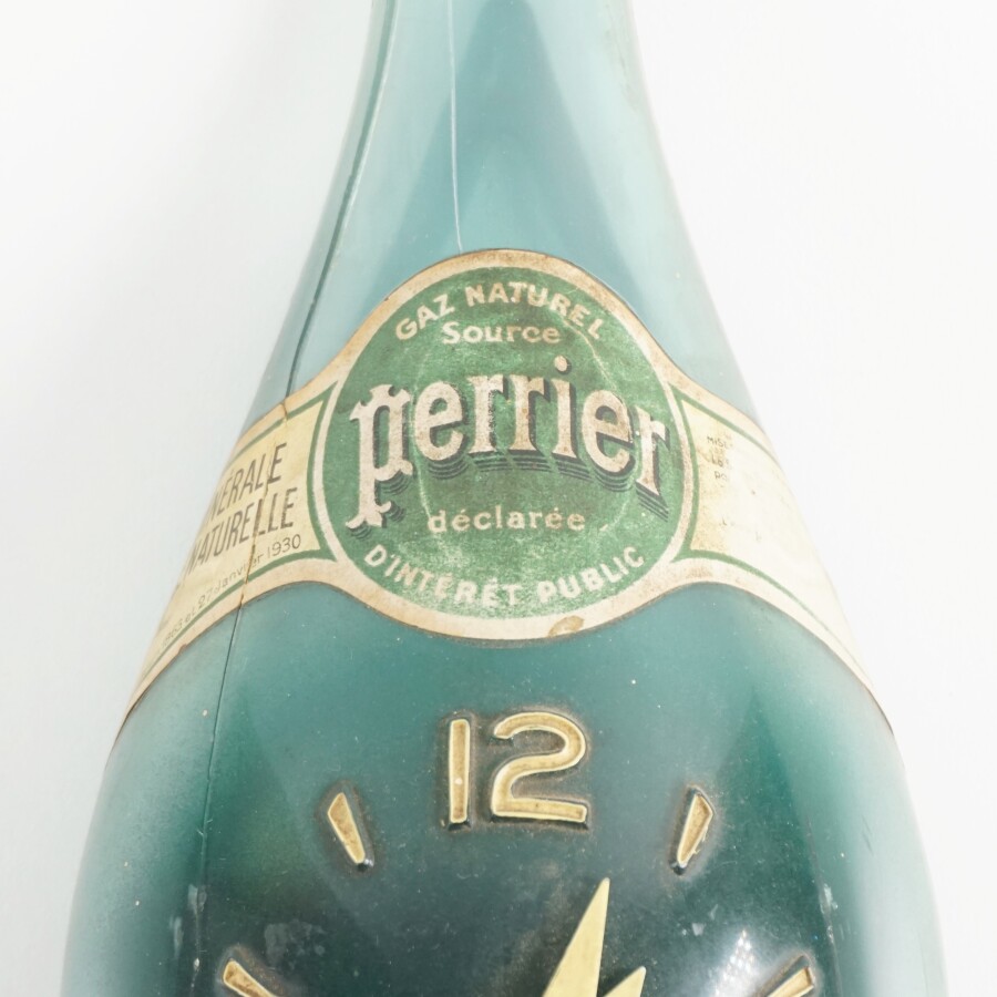 PERRIER : Pendule publicitaire pour la marque Perrier, représentant une demi bouteille avec un mouvement mécanique à réviser, H. 30 cm.