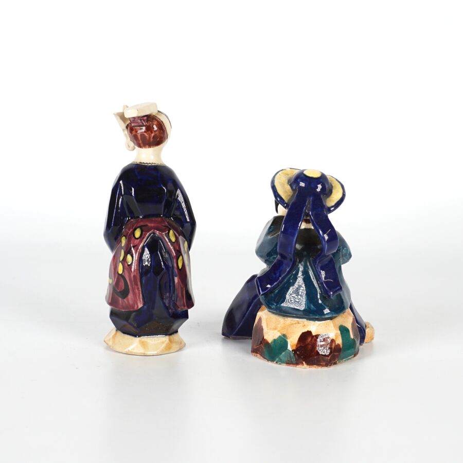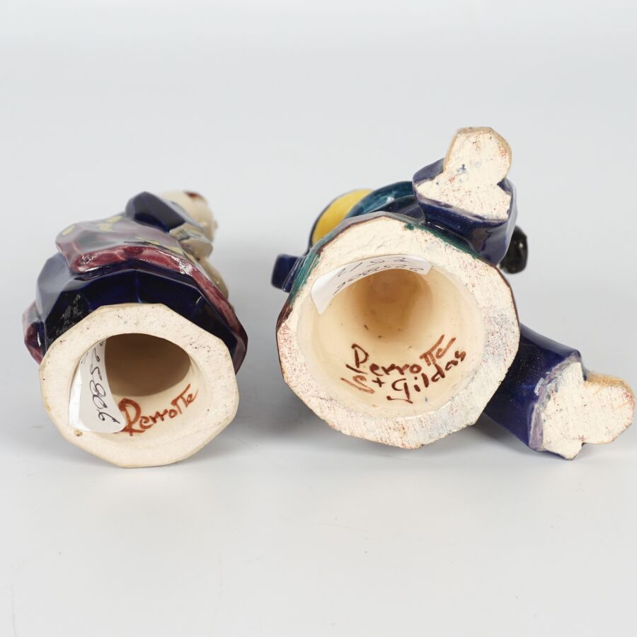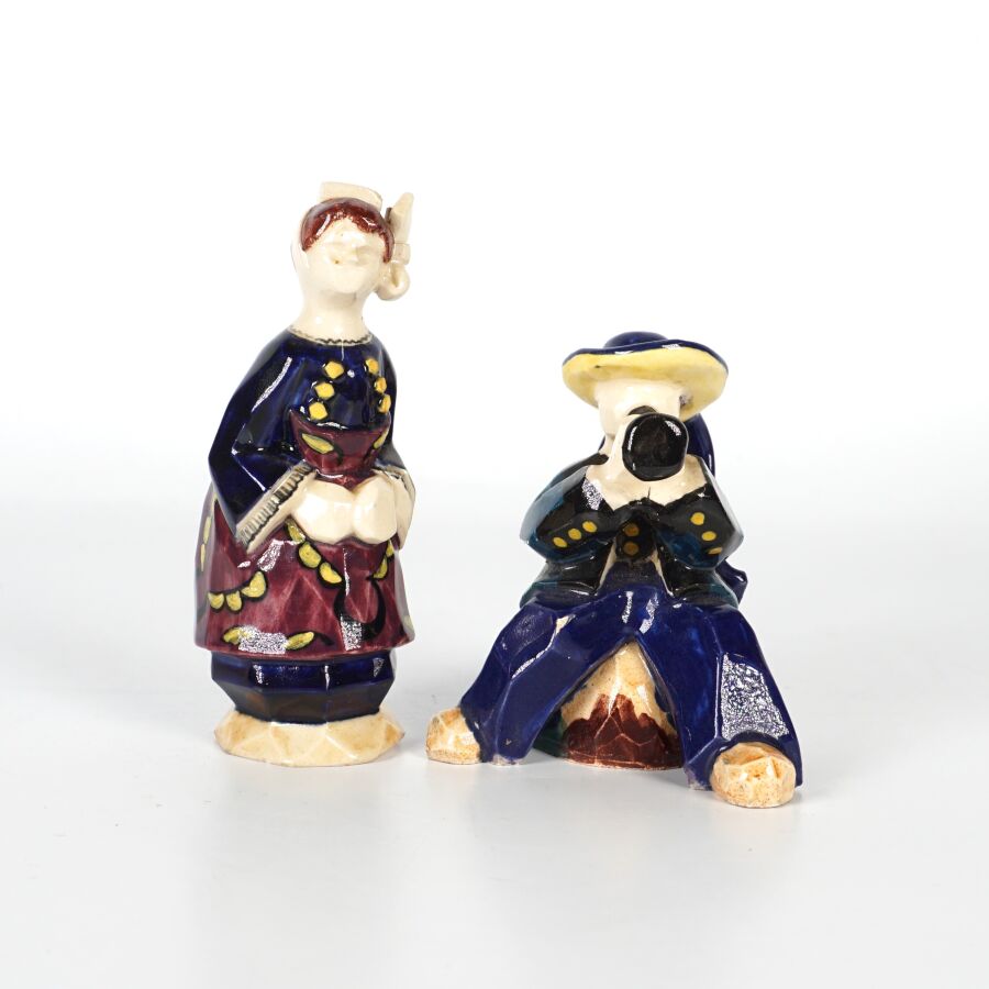 PERROTTE (Saint-Gildas-de-Rhuys) : Paire de sujets en faïence émaillée polychrome représentant un joueur de bombarde trégorois en costume d'été et sa femme, signés dessous, H. 10 cm (infime éclat au chapeau).