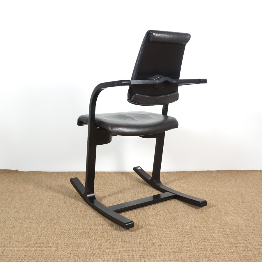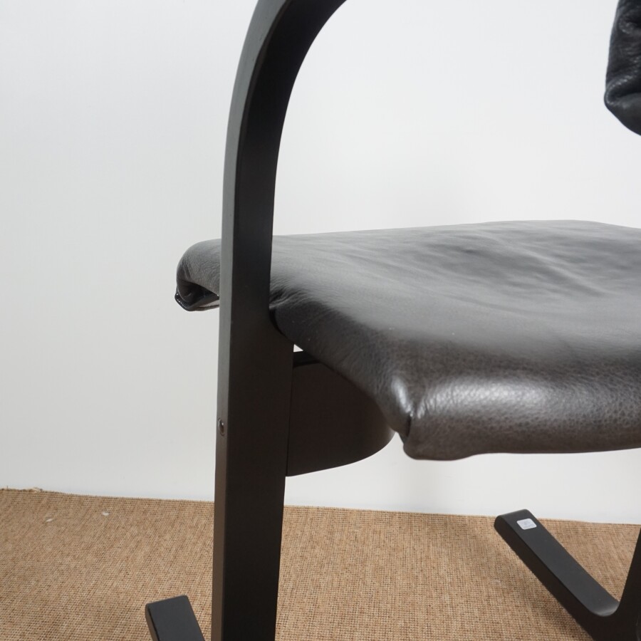 Peter OPSVIK (1939) - STOKKE : Paire de fauteuils modèle "Actulum", bois laqué noir et cuir noir, H. 90 cm. L. 65 cm (bel état, quelques très légers sauts au bois).