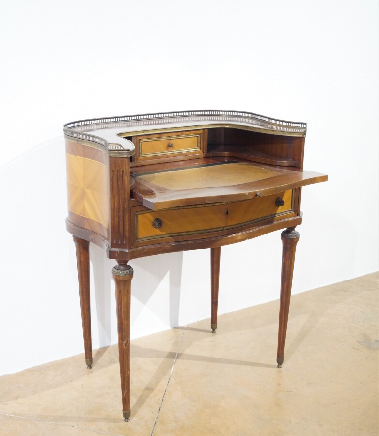 Petit bureau à gradin de style Louis XVI galbé et plaqué toutes faces d'acajou et bois fruitier, il présente deux casiers latéraux et un tiroir en partie supérieure, plateau écritoire à tirette gainé de cuir insolé, un tiroir en ceinture, quatre pieds cannelés, bagués et fuselés, ornementations de bronzes telles que poignées de tirages en bouton, sabots et frise d'oves, H. 88 cm, L. 70.5 cm, P. 50 cm (avec un clé, manque 1 entrée de serrure, petites usures au cuir et au placage).