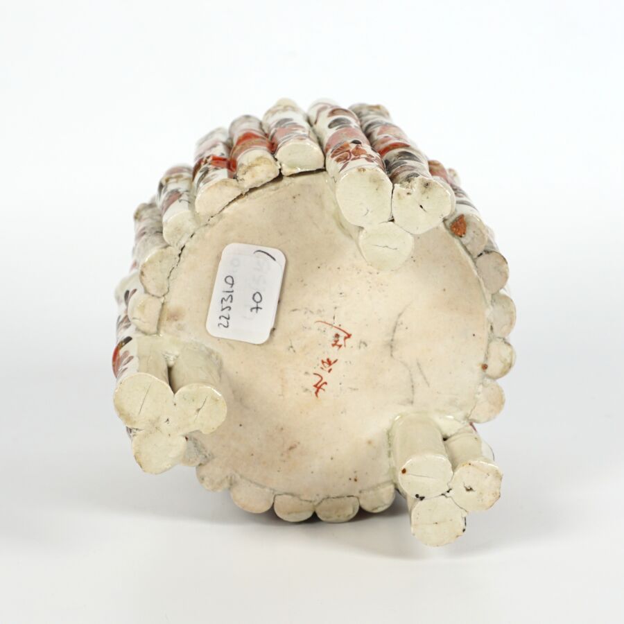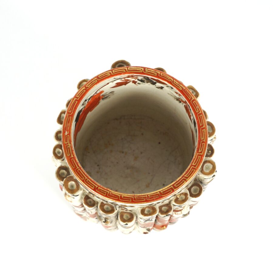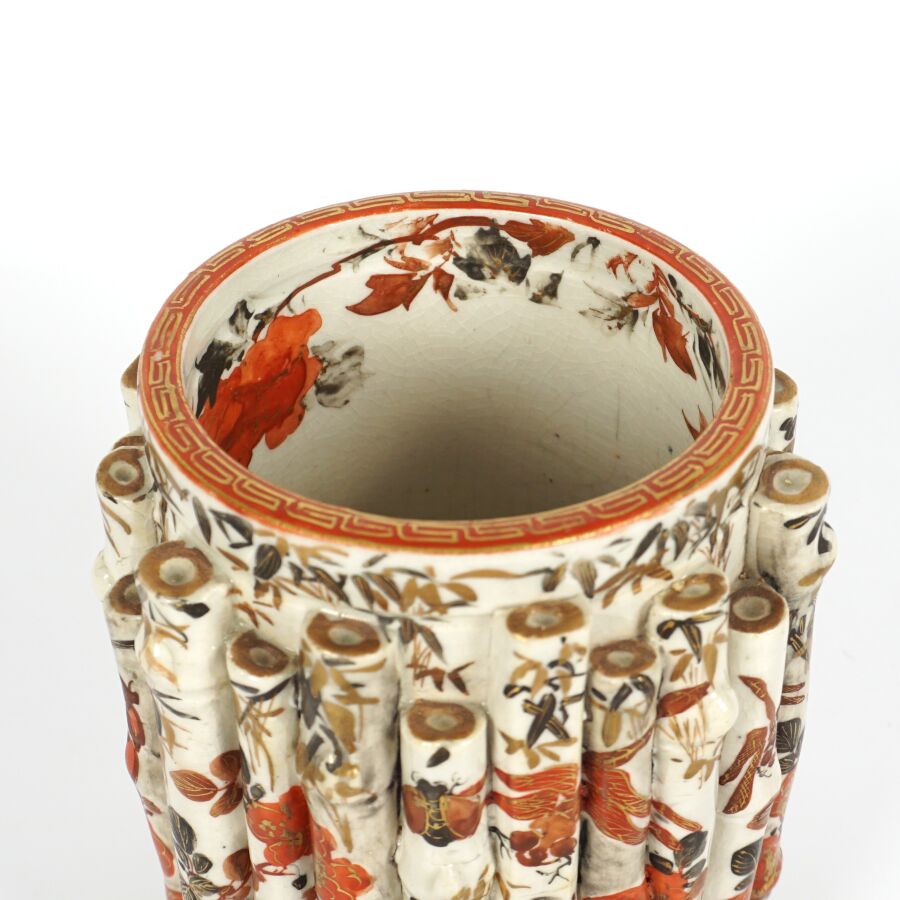 Petit cache-pot tripode en forme de bambou en porcelaine émaillée de Kutani en rouge, brun et or d'insectes et fleurs, Japon, fin du 19ème - début du 20ème siècle, H. 12.5 cm.
