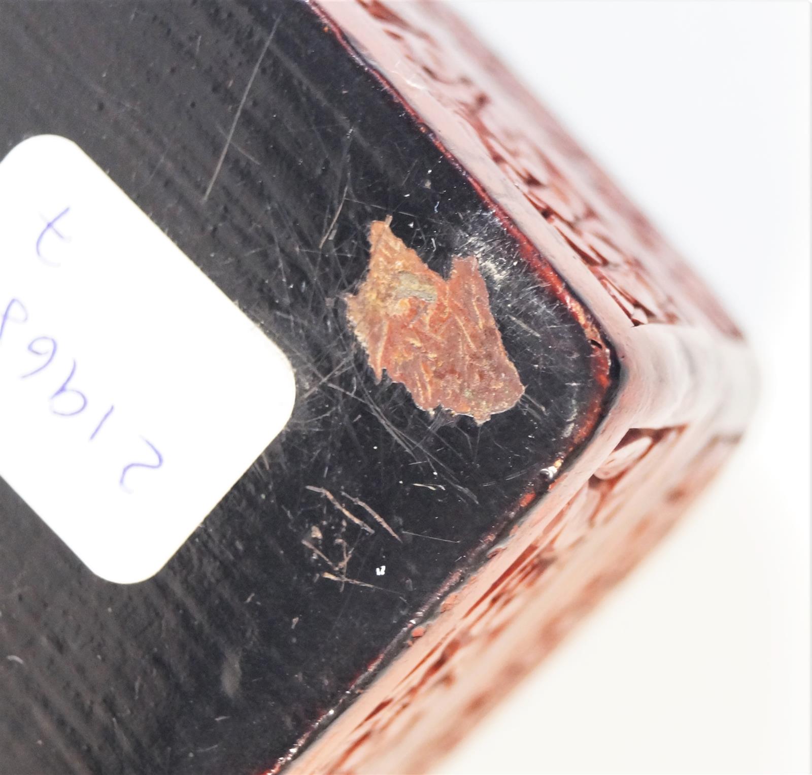 Petit coffret rectangulaire style laque de cinabre sur une âme en bois, décor sculpté en relief figurant deux chiens jouant et de frise de fleurs, Chine, vers 1900, 15.5 cm x 9.5 cm (infimes usures).