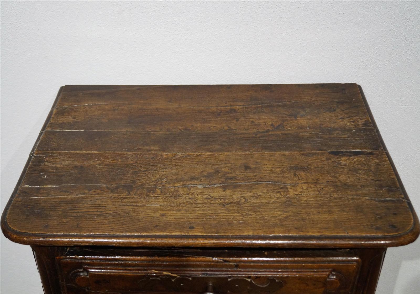 Petit confiturier en chêne teinté ouvrant à un tiroir et une porte en façade, petits pieds cambrés à l'avant, fin du 18e siècle, H. 99 x L. 70 x P. 50 cm (avec une clé, pieds arrières restaurés)