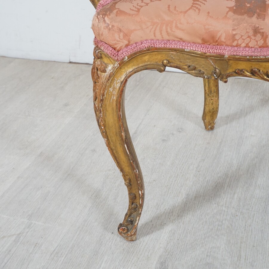 Petit fauteuil tripode, bois sculpté et doré orné de rinceaux et rocaille, garniture couverte de tissu rose à motif de feuillage, 19ème siècle, H. 63.5 cm (trace au tissu sur l'assise, petites usures).