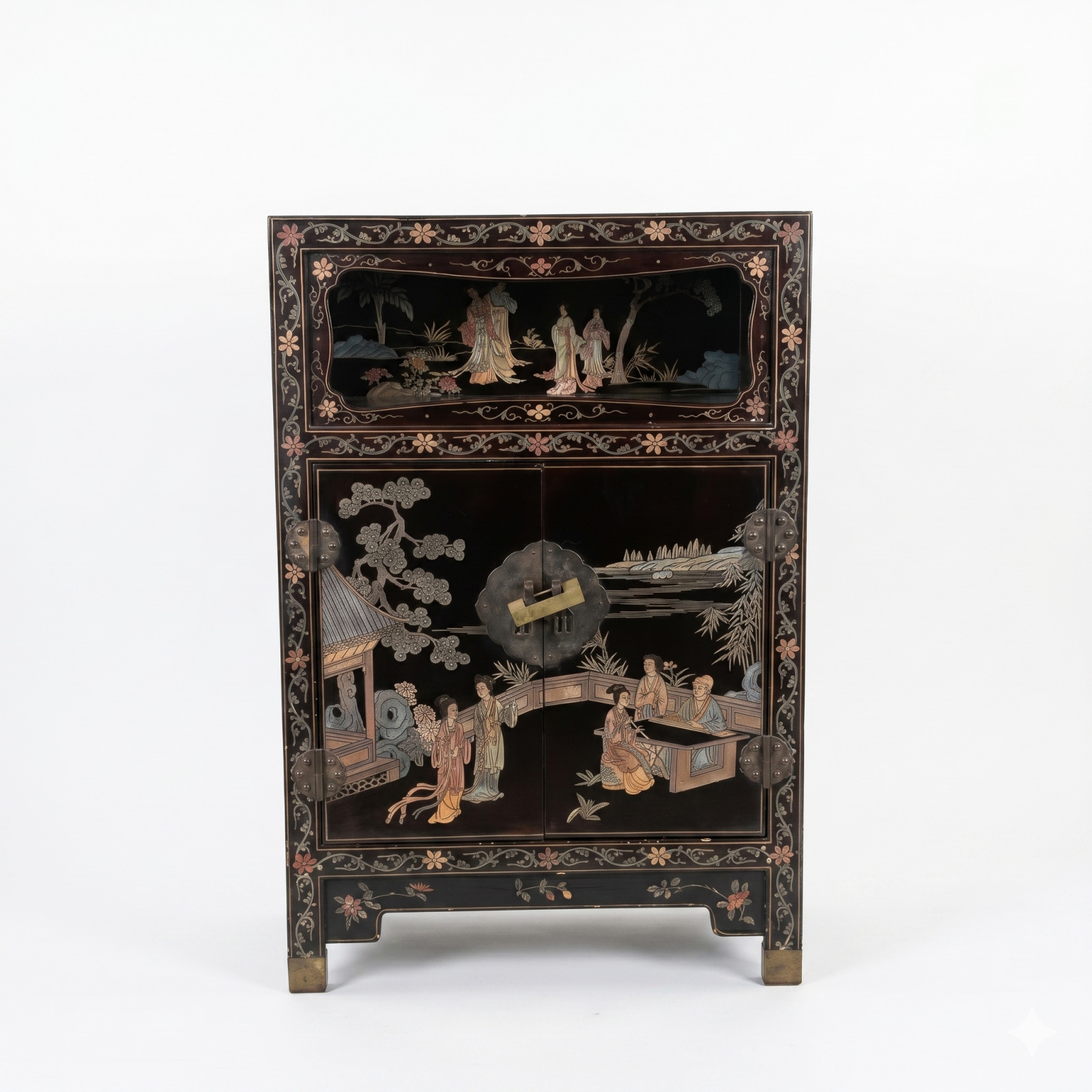 Petit meuble de style extrême-oriental, à décor dans le goût du japonisme, en bois laqué noir, incrusté de nacre figurant des scènes animées de personnages, pavillons et paysages, ouvrant par deux vantaux en façade, la partie supérieure ajourée formant tablette et niche, les montants et encadrements soulignés de décors floraux, 91.7 x 61.5 x 31 cm.