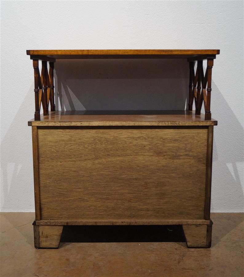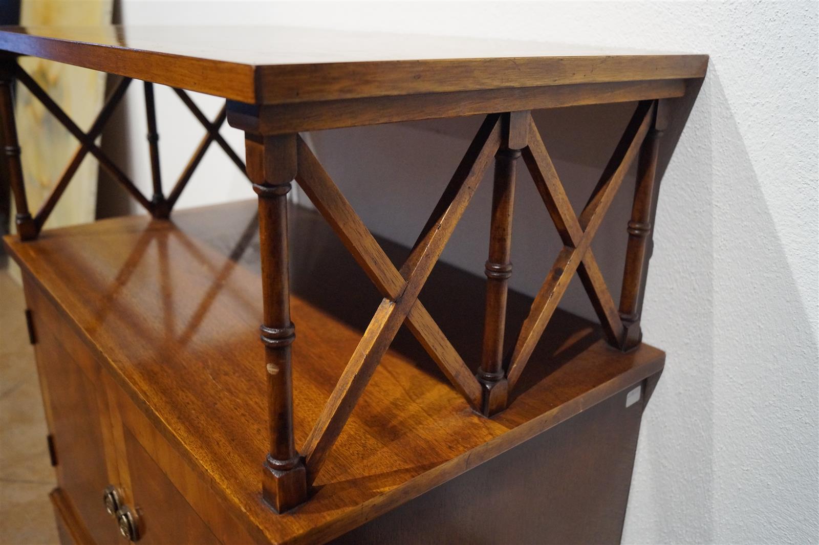 Petit meuble TV en bois de placage ouvrant à deux vantaux en partie basse et un casier ajouré à décor de croisillons à l'imitation du bambou. H. 78 cm, L. 71 cm, P. 40.5 cm
