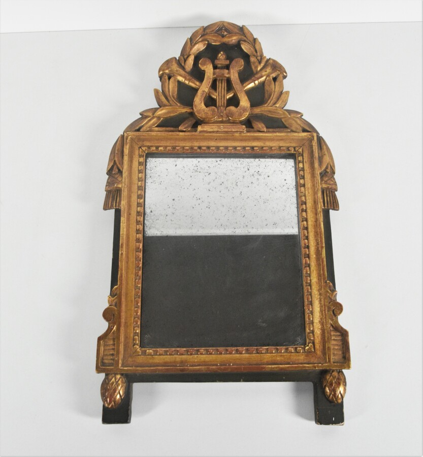 Petit miroir en bois doré rechampi vert brun, chapiteau aux attributs de la musique, époque Louis-Philippe, H. 56 cm (usures et piqures au verre).