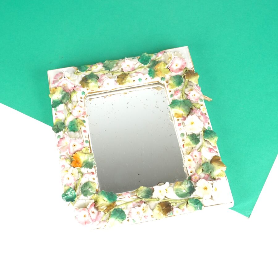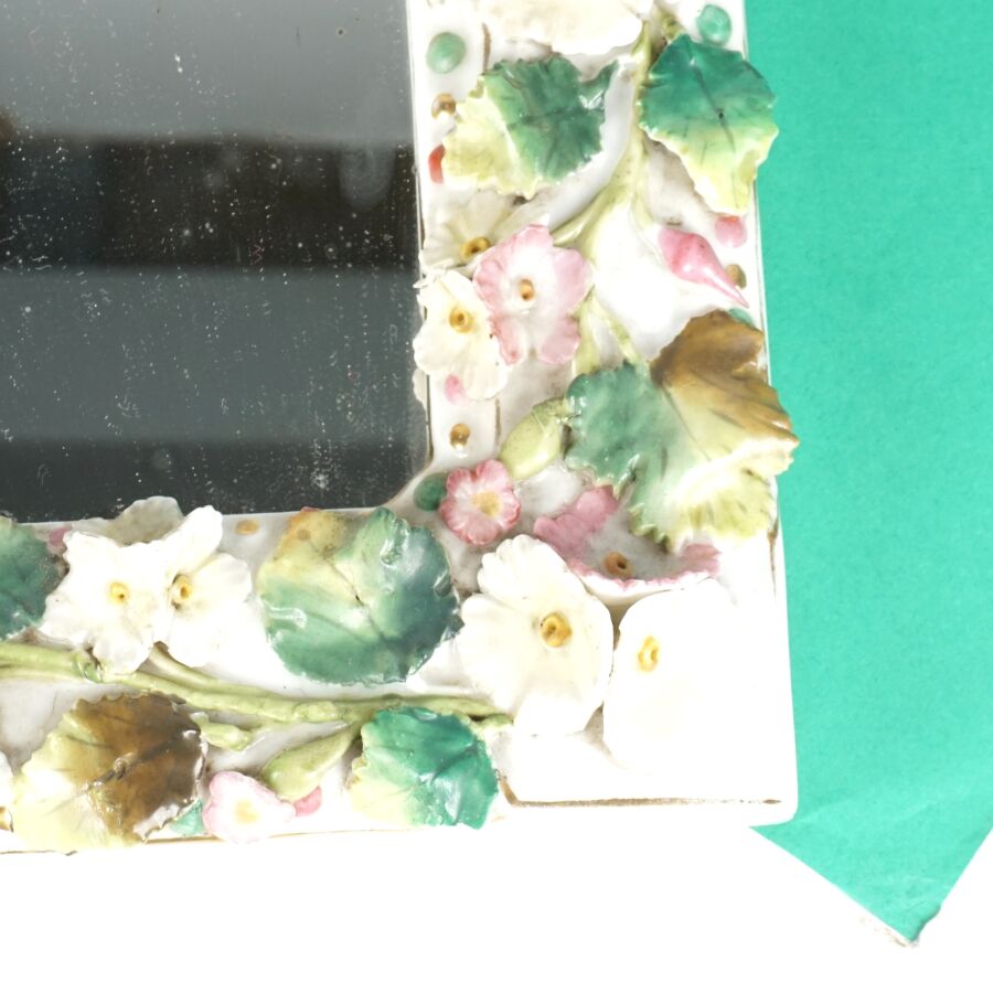 Petit miroir en porcelaine émaillée polychrome à décor de fleurettes, circa 1900, Dim. 21 x 18 cm.