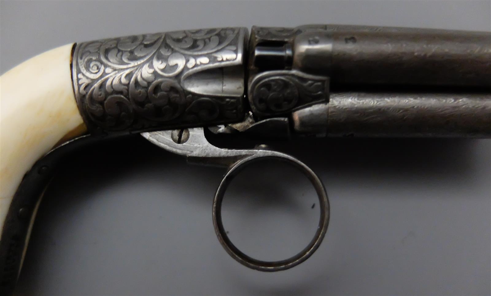 Petit REVOLVER POIVRIERE MARIETTE A PERCUSSION, à 4 canons et 4 coups, canons ronds damas de 3,2 cm séparés et à balles forcées et numérotés de " 1 " à " 4 ", carcasse arrondie à riche décor de rinceaux feuillagés, détente en anneau, bride marquée sur deux lignes " MARIETTE BREVETE ", plaquettes de la crosse en ivoire, mécanisme semblant fonctionnel, longueur 11,5 cm, vers 1850, BE/TBE.