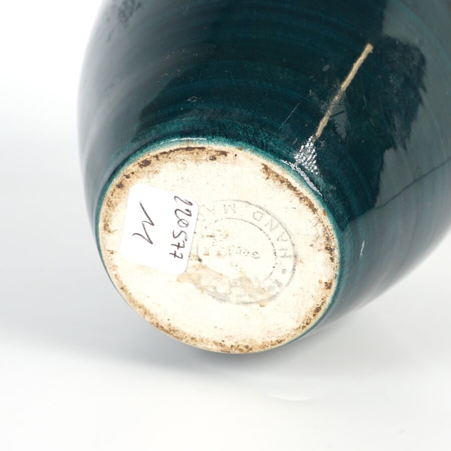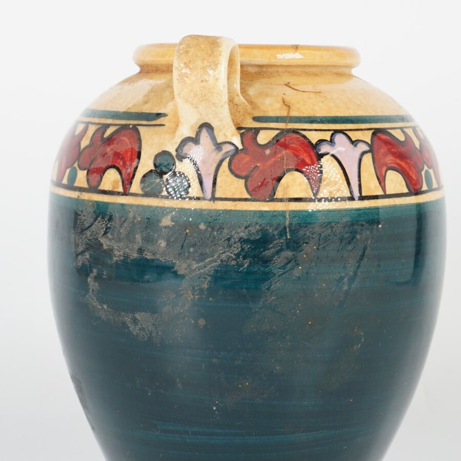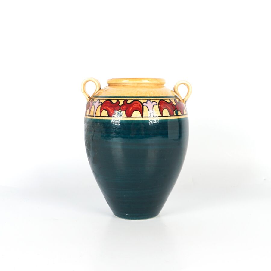Petit vase de forme ovoïde à deux anses en faïence émaillée polychrome orné d'une frise à décor tournant de végétaux, marque au tampon sur la base, H. 17 cm.
