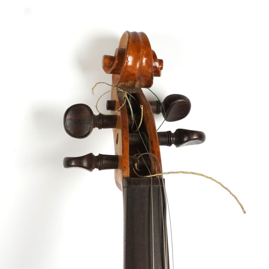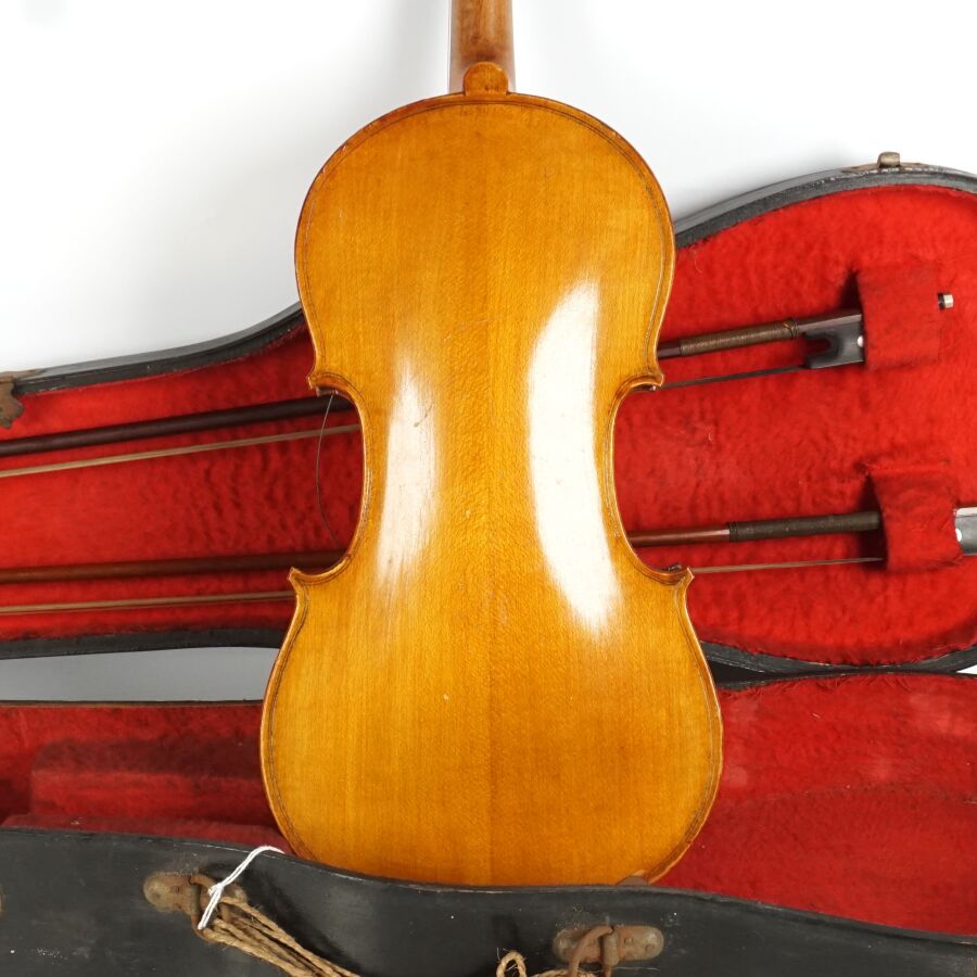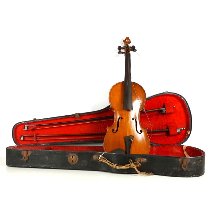 Petit violon d'étude 3/4 portant l'étiquette "Modèle d'après Antonius Stradivarius cremonensis faciebat anno 1721", présenté avec deux archets et dans un étui, L. 56.5 cm (rayures, usures).