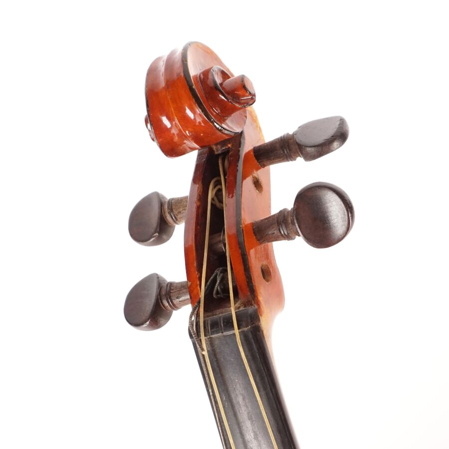 Petit violon d'étude présenté avec son archet et son étui, L. 45 cmn (archet accidenté, chevalet à refixer, manque une corde, usures).