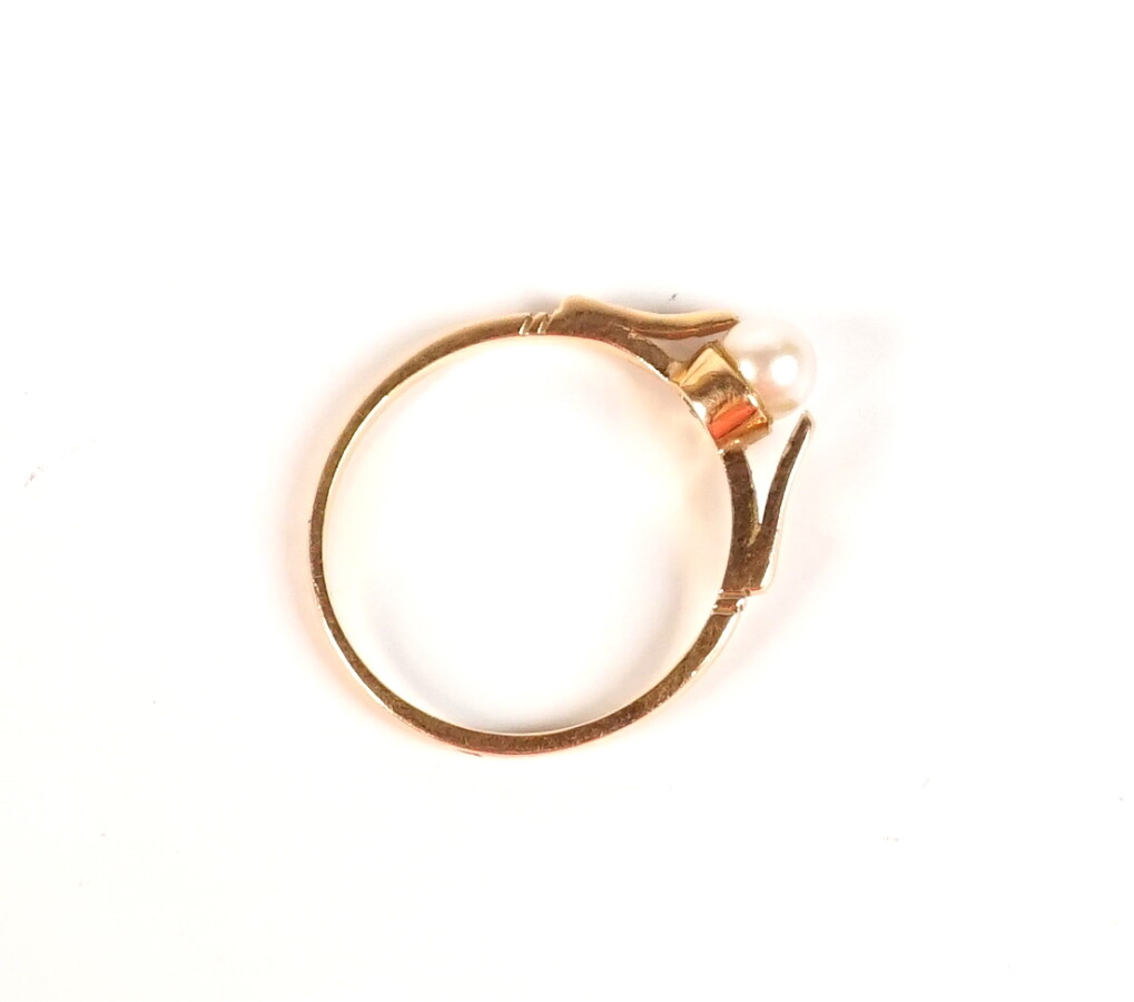 Petite bague en or jaune 18K (750/oo) ornée d'une perle 4 mm épaulée de 2 languettes (l'une légèrement tordue). TDD 55. Poids brut : 2 g environ.