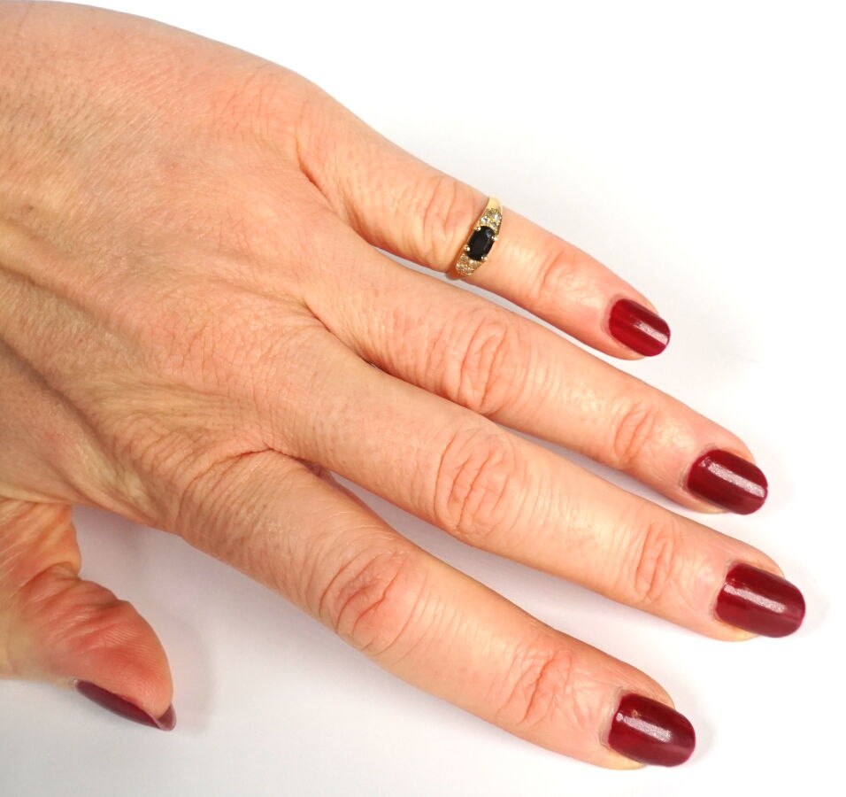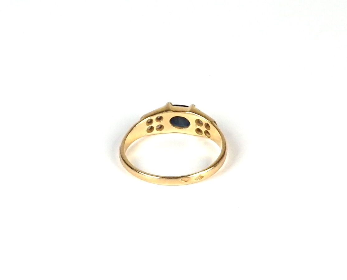 Petite bague en or jaune 18K (750/oo), sertie au centre d'un saphir taille ovale épaulé de 4 petits diamants ronds. TDD 46.5. Poids brut : 1.7 g environ.