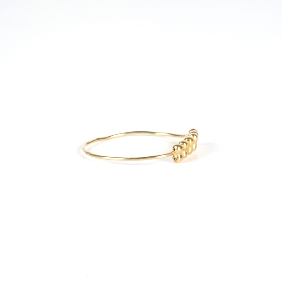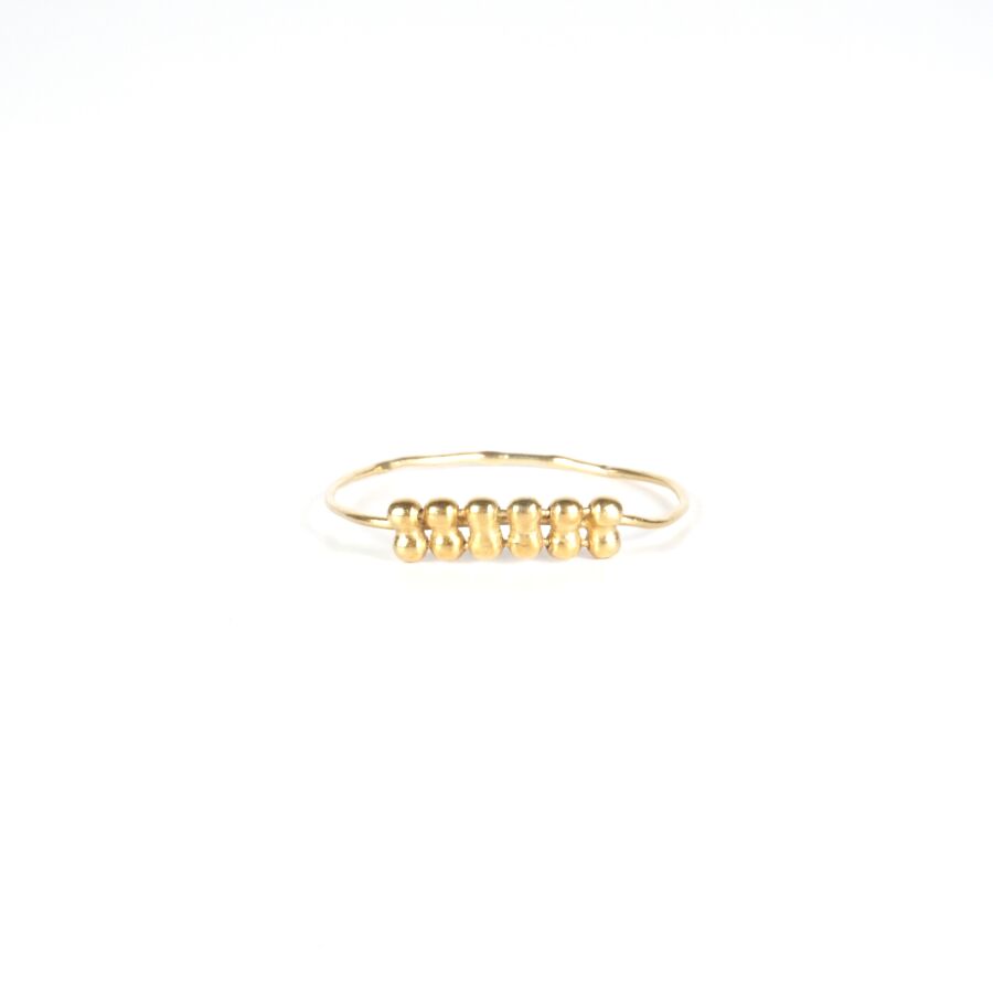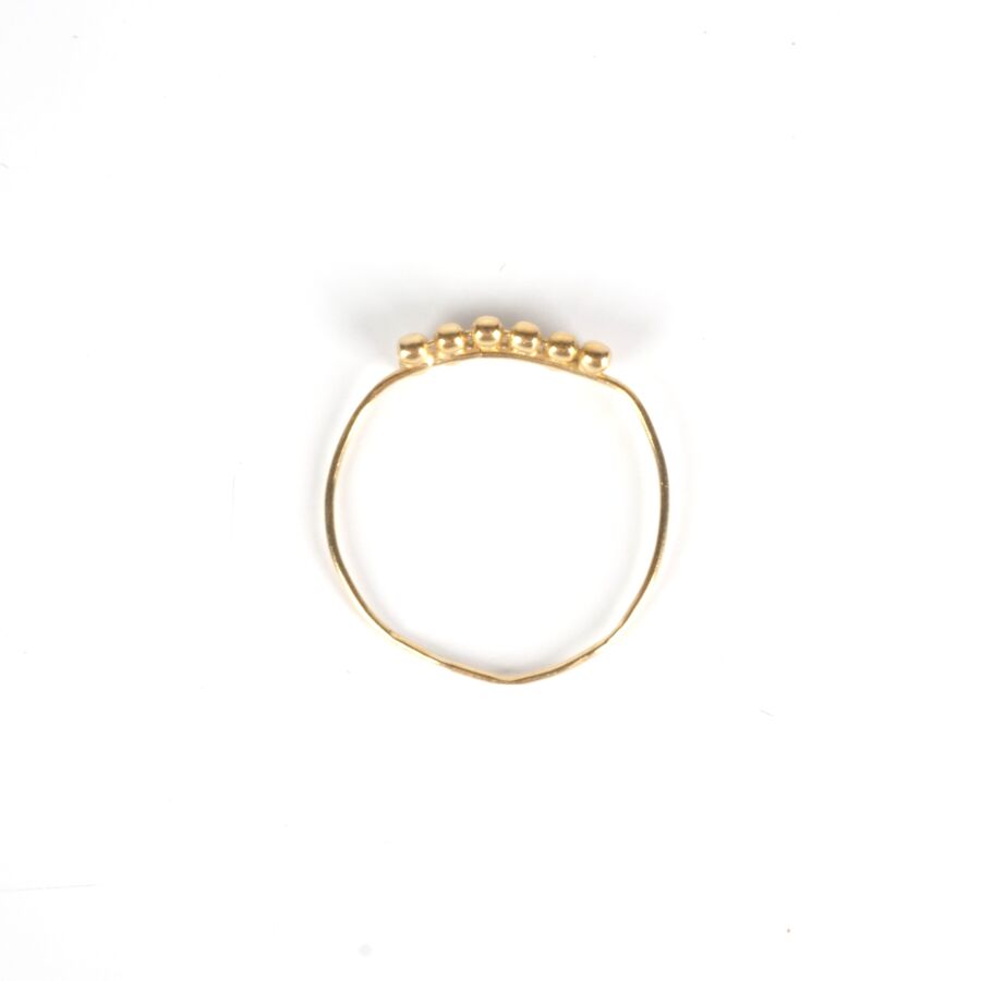 Petite bague en or jaune 18K (750/oo), sertie de 12 petites boules d'or, Larg. 3 mm. TDD. 55. Poids brut : 0.6 g environ (déformations).