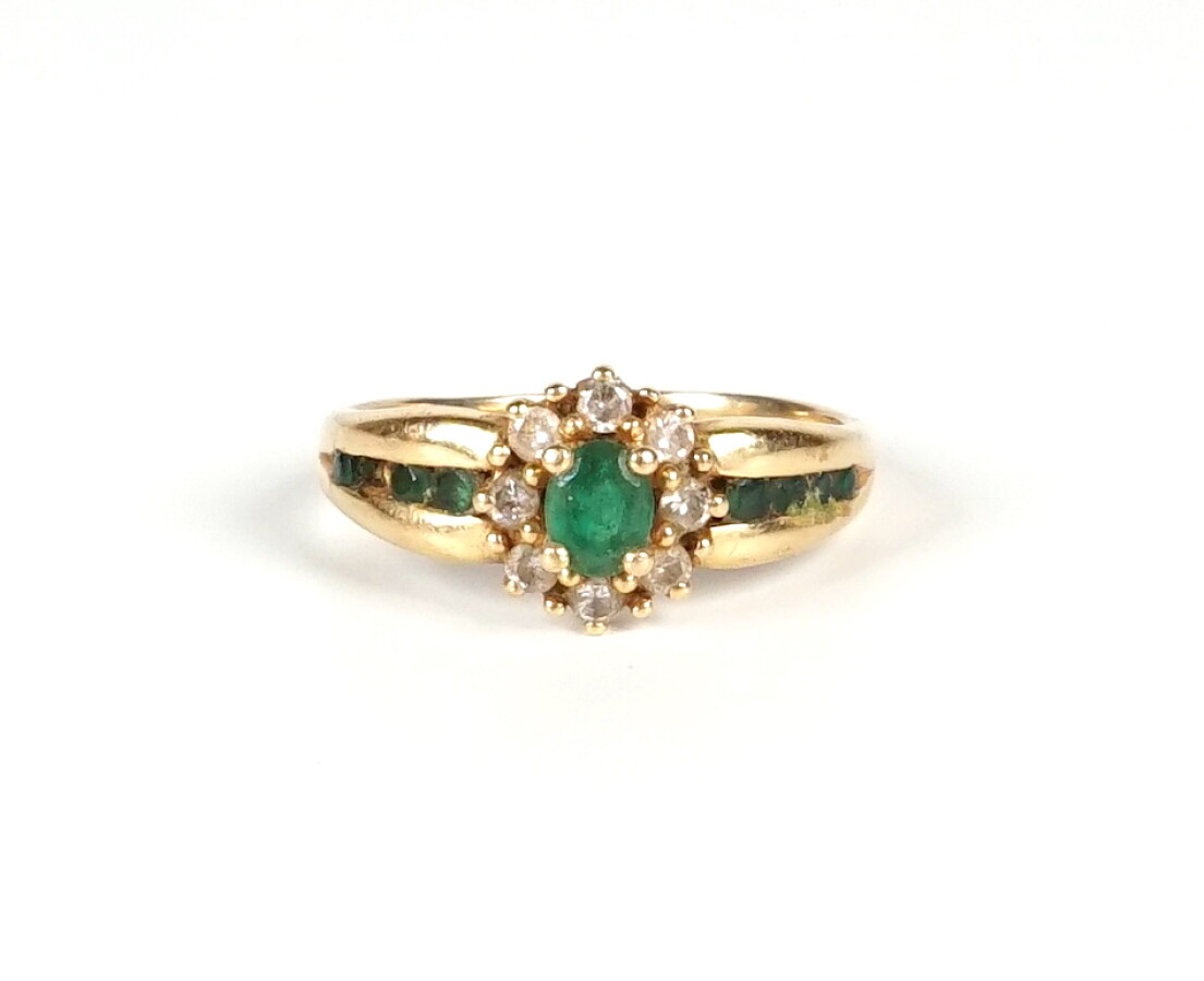 Petite bague "Fleur" en or jaune 18K (750/oo) sertie au centre d'une émeraude taille ovale calibrant 0.2 ct environ, dans un entourage de petits diamants ronds, l'ensemble épaulé d'une ligne de petites émeraudes rondes serties en rail (1 manque). TDD 54. Poids brut : 2.9 g environ.