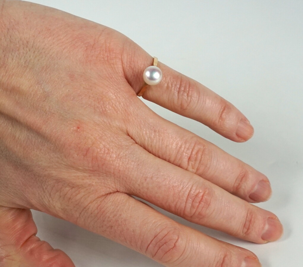 Petite bague "Perle" en or jaune 18K (750/oo) sertie d'une perle de culture 7 mm. TDD 51. Poids brut : 2 g environ.