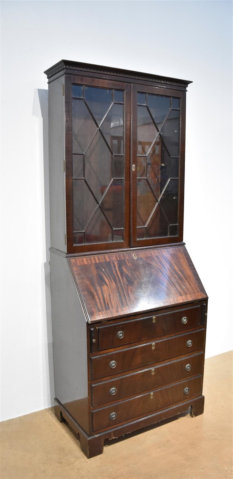 Petite bibliothèque deux corps de style anglais, ouvrant à deux portes vitrées, un abattant et quatre tiroirs en partie basse, elle est coiffée d'une corniche à décor de denticules, 76 x 45 x H. 193 cm