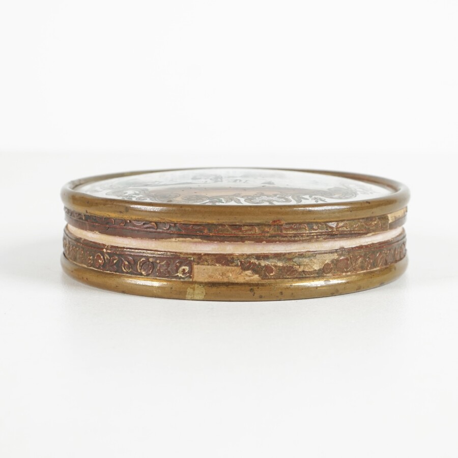Petite boîte à pilule ronde, carton et aquarelle, le couvercle orné d'un couple galant, fin du 18ème siècle, Diam : 8.5 cm (manque à l'huile, petites usures).