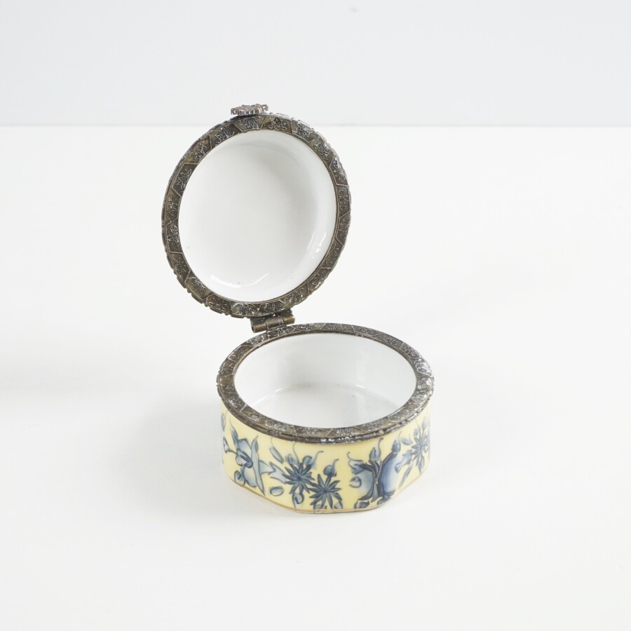 Petite boîte ronde en porcelaine émaillée polychrome à décor de fleurs bleues sur fond jaune et rehauts d'or, Diam : 6.3 cm.