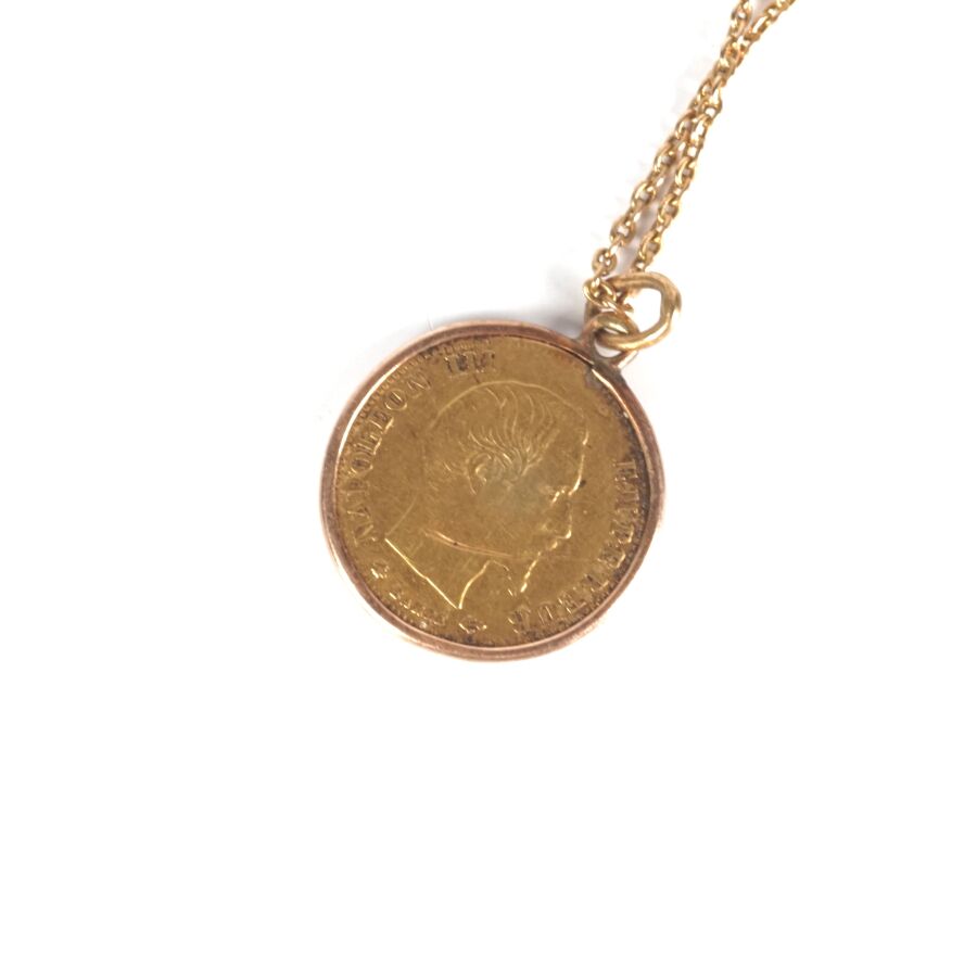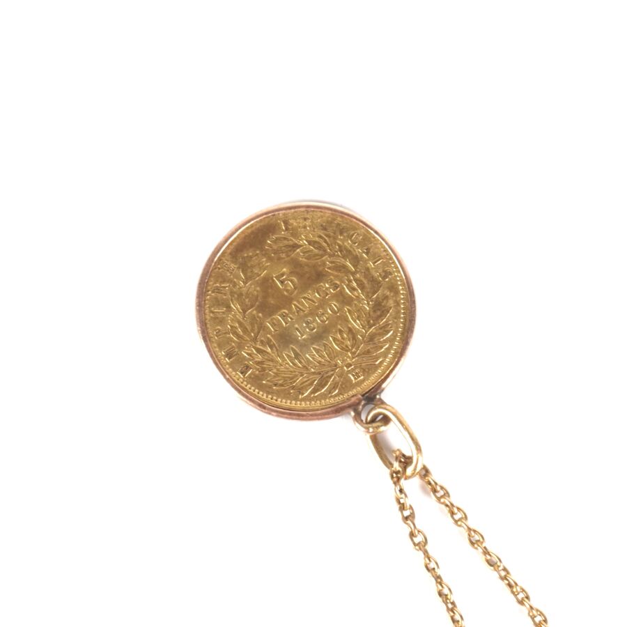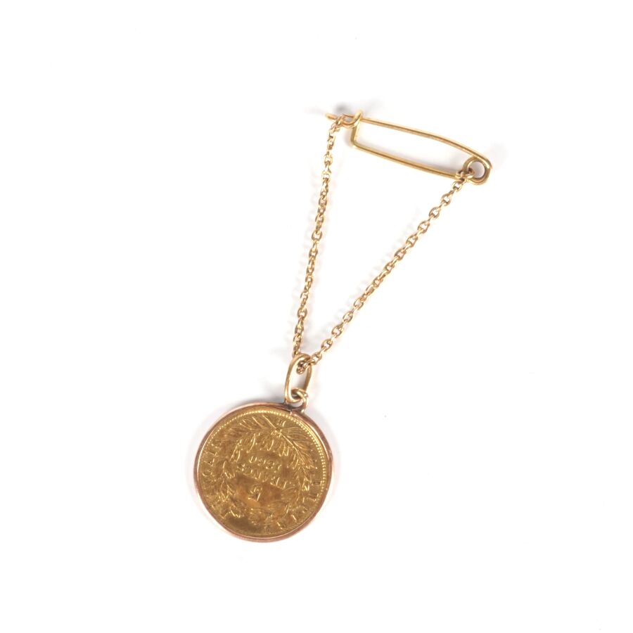Petite broche en or jaune 18K (750/oo), à motif d'une épingle retenant par une chaîne maille forçat une monnaie de 5 Francs or Napoléon III "Tête nue", 1860, L. Epingle : 2.3 cm/ Larg. Epingle : 5 mm. H. Totale : 5.6 cm. Poids brut : 3 g environ.