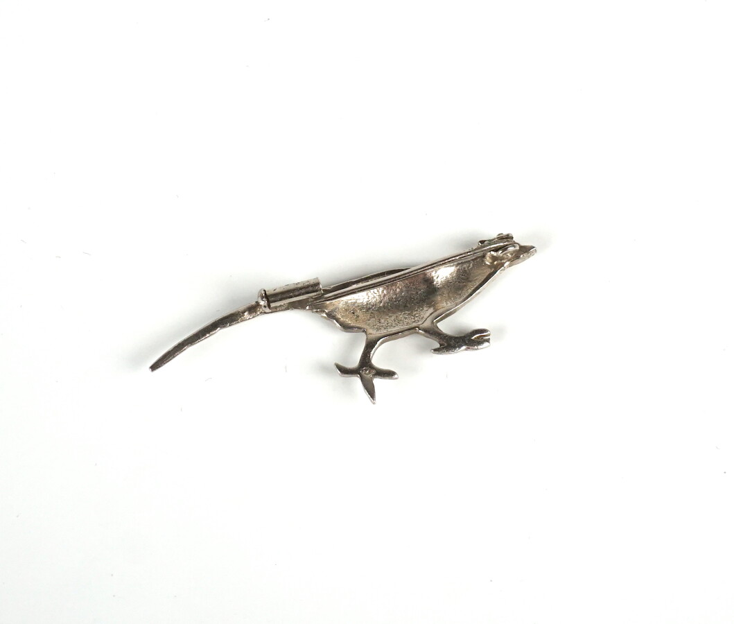 Petite broche "Faisan" en argent (800/oo), pavée de marcassites, l'oeil serti d'une pierre orangée, L. 5.5 cm. Poids brut : 3.9 g environ.