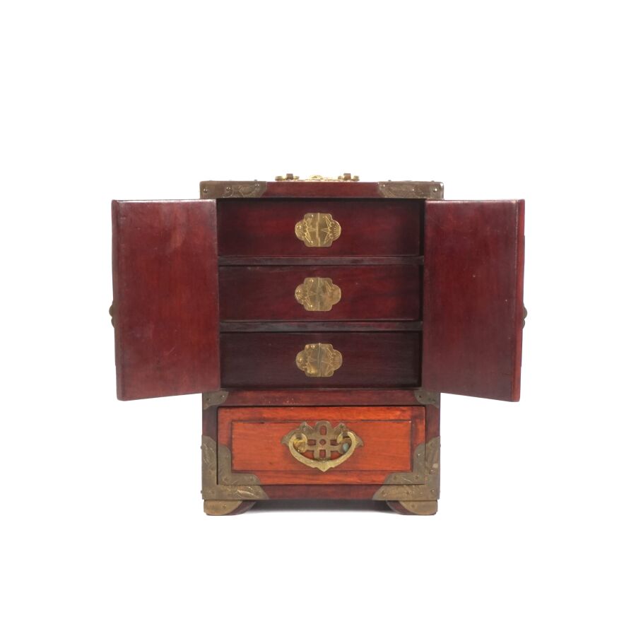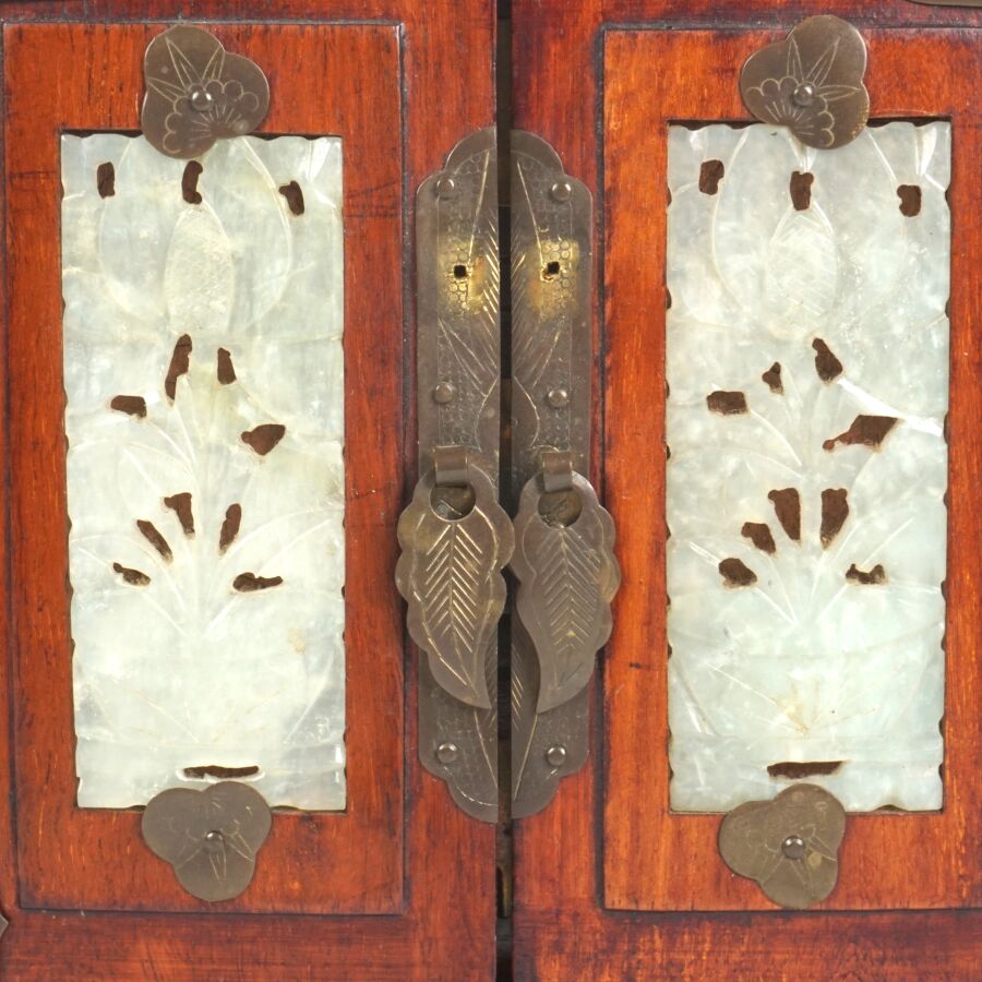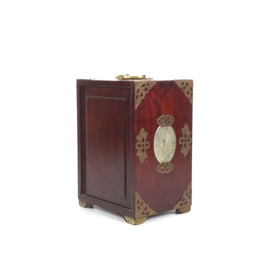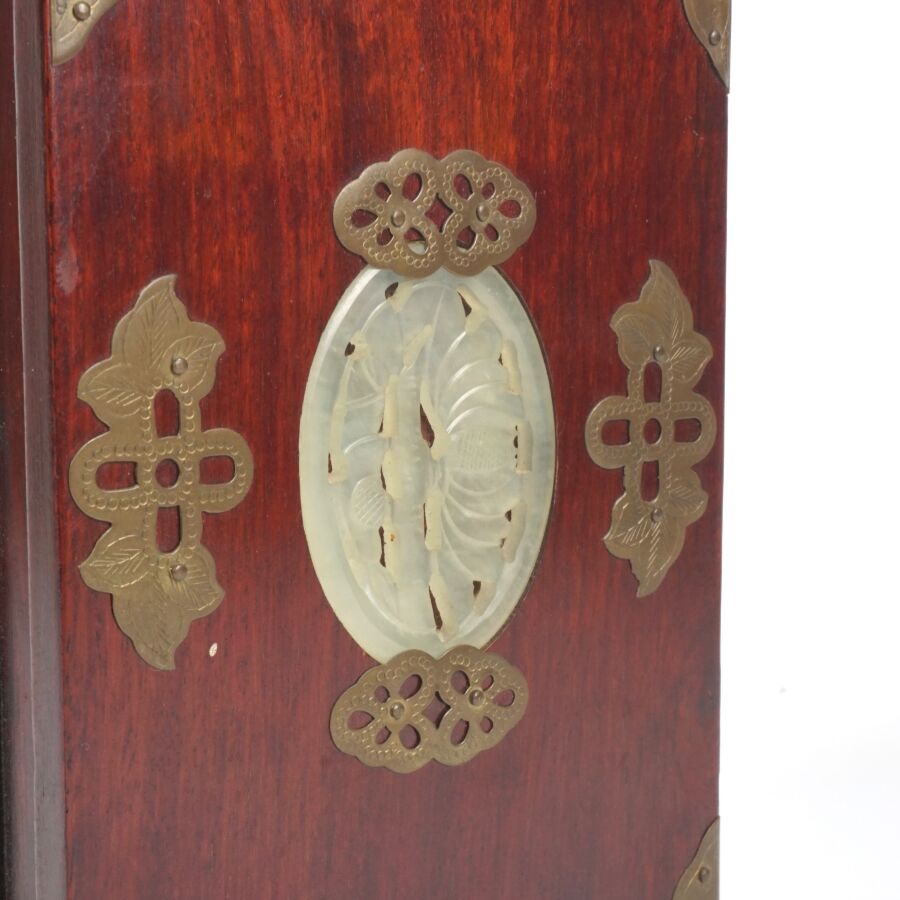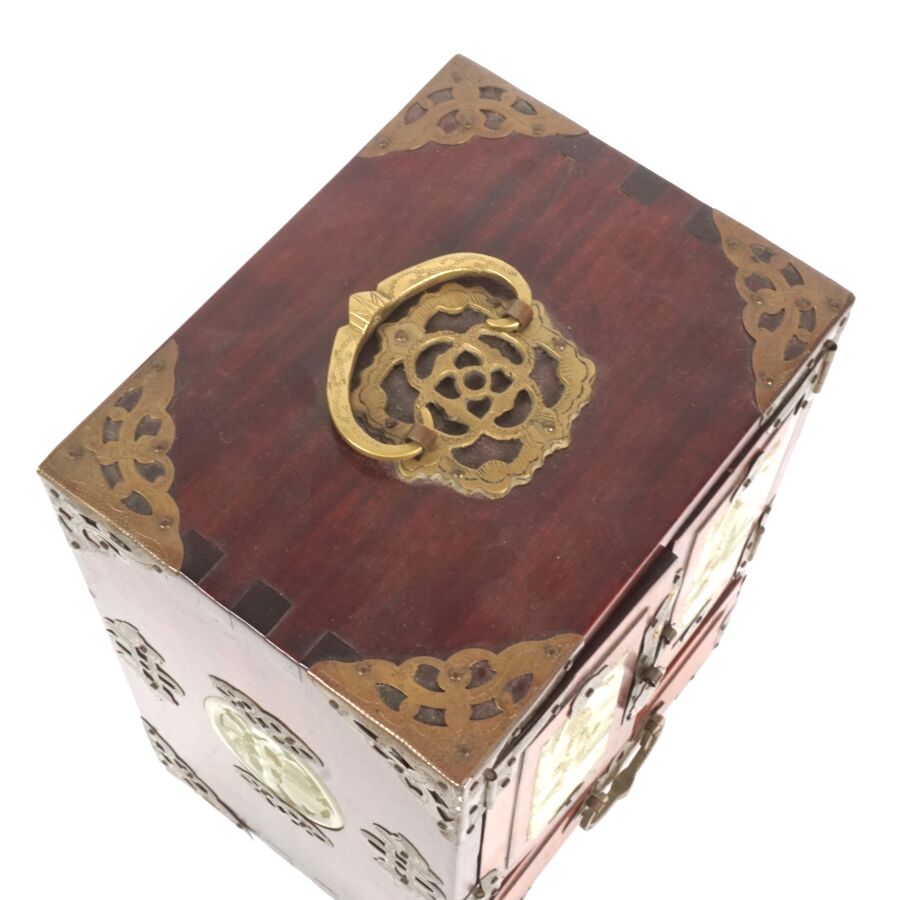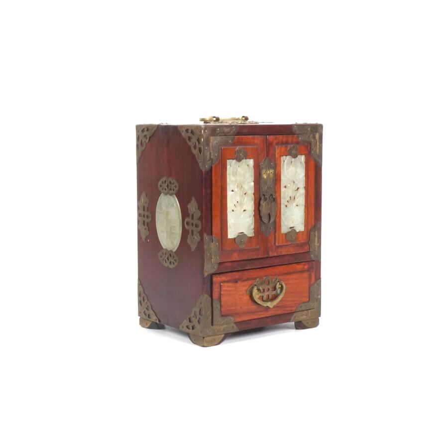 Petite cabinet portatif formant coffret à bijoux en bois, laiton ciselé et serpentine, ouvrant en façade à deux vantaux ornés chacun d'une plaque en serpentine céladon à motif ajouré de composition florale, découvrant trois tiroirs, un tiroir en partie basse, les deux côtés ornés chacun d'une plaque ovale en serpentine céladon ajouré à décor de bambous, Chine du sud, début du 20ème siècle, H. 21.5 x 15.3 x 12 cm.