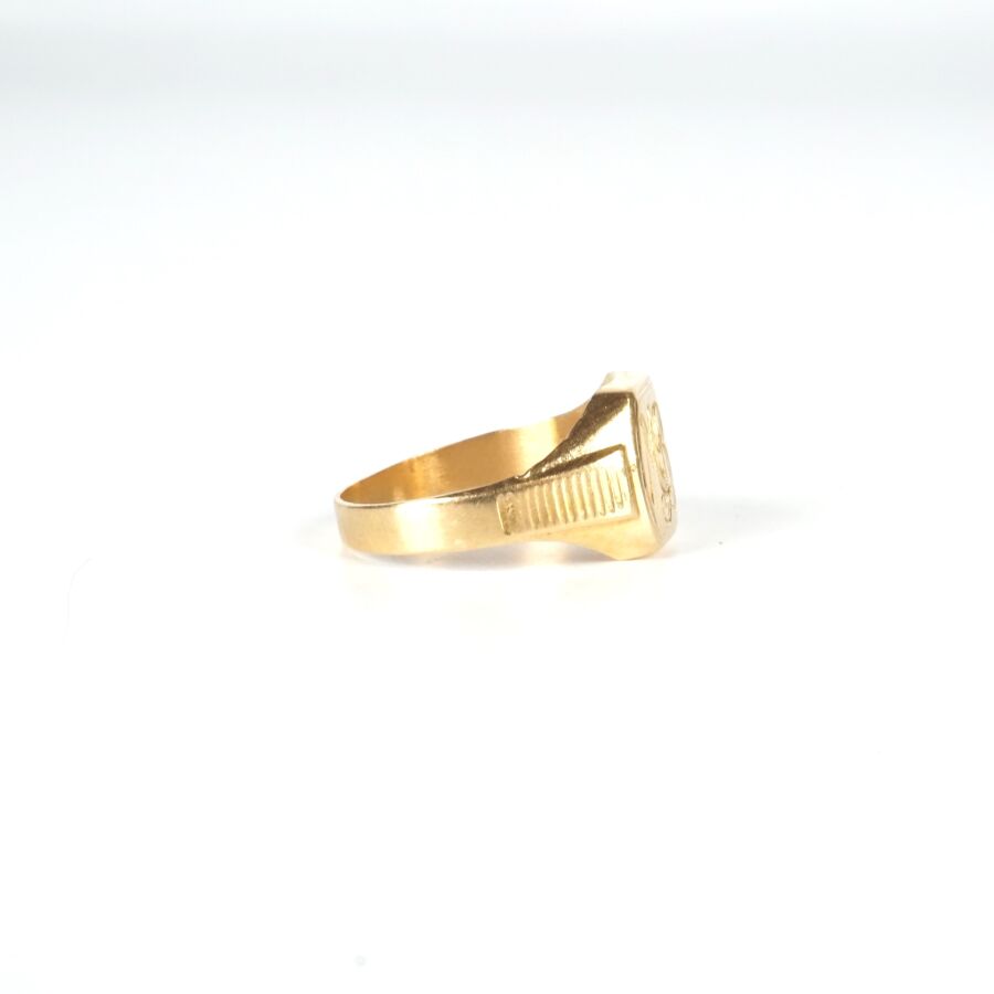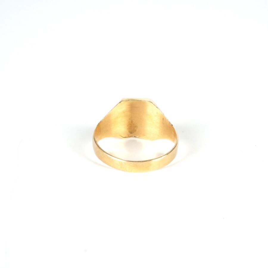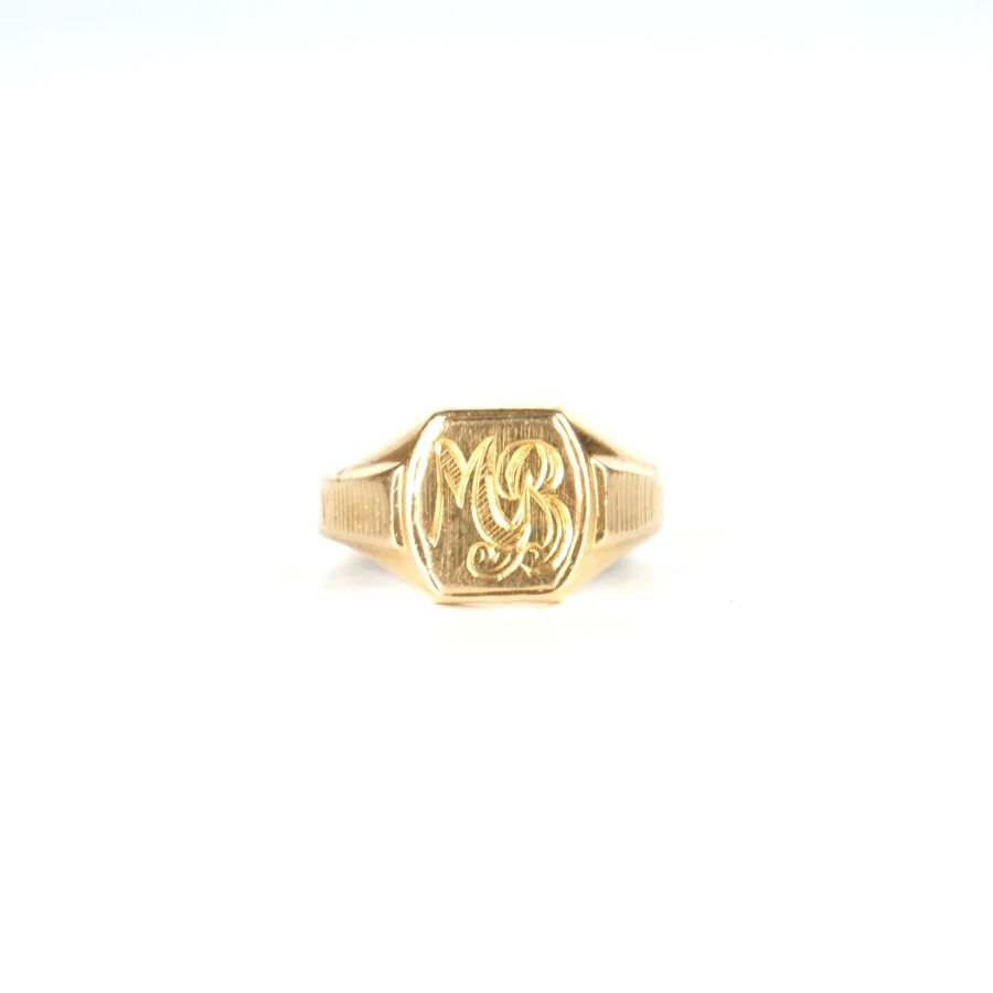 Petite chevalière en or jaune 18K (750/oo), le plateau de forme tonneau orné des initiales "MB", TDD. 44.5/45. Dim. Plateau : 8 x 8 mm. Poids brut : 1.6 g environ.