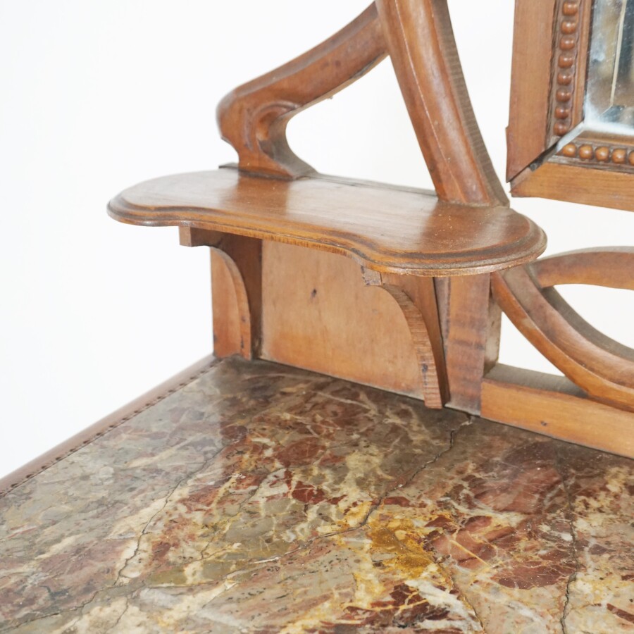 Petite coiffeuse de style Art nouveau en bois sculpté, plateau rectangulaire coiffé d'un marbre brèche supportant un miroir encadré de deux petites selettes, ceinture ajourée à décor d'entrelacs, l'ensemble reposant sur quatre pieds nervurés réunis par une tablette d'entretoise, 20ème siècle, H. 132 cm x 69 cm x 47.4 cm (fentes au marbre, un élément en bois cassé).