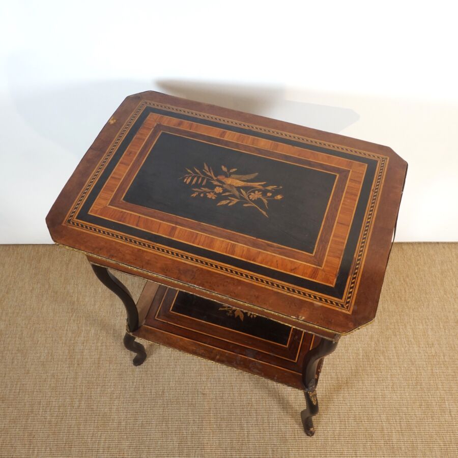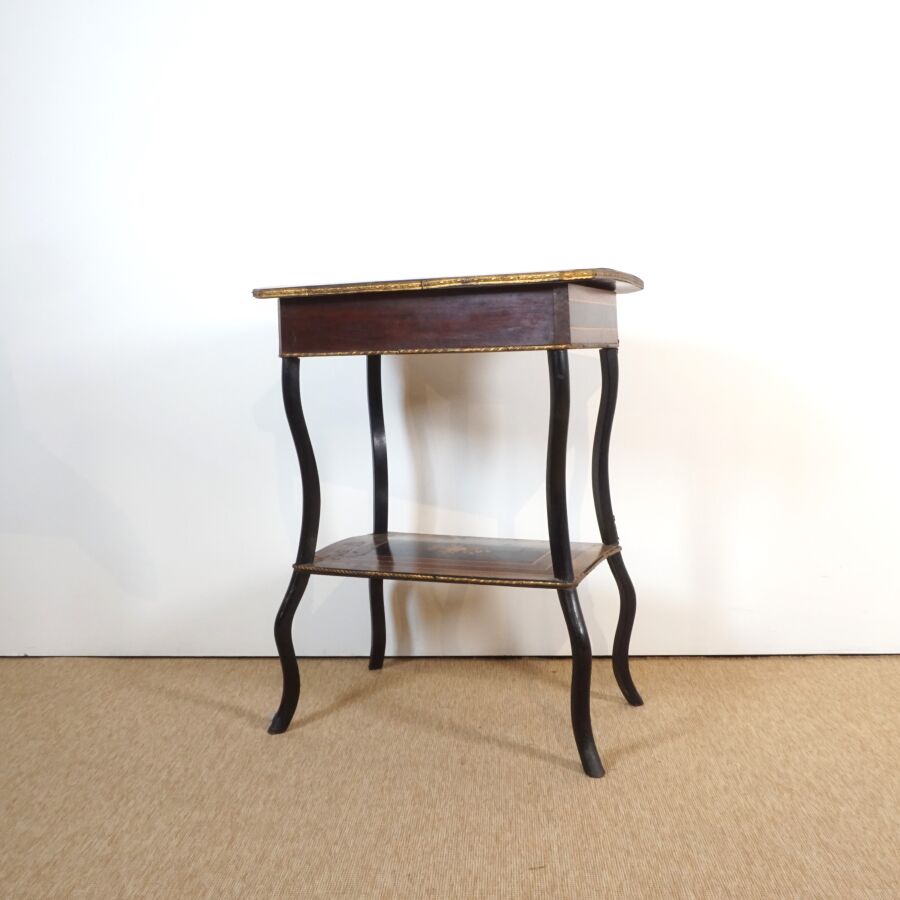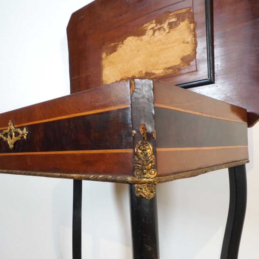 Petite coiffeuse en bois teinté, couvercle à abattant découvrant compartiments, reposant sur quatre pieds reliés par une entretoise à décor de fleurs, Dim. 75,5 x 58 x 40 cm (avec clé, manque le miroir intérieur, usures, petits sauts, manques au placage, taches, deux baguettes à refixer).